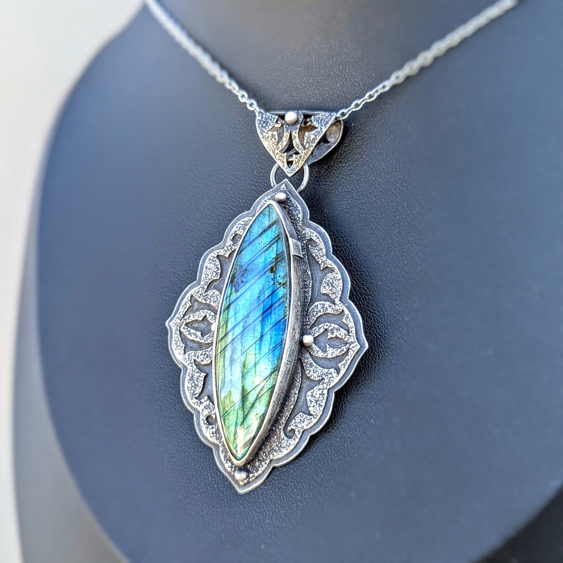 At the heart of the piece is an elongated marquise labradorite, alive with iridescent flashes of blue, teal, and gold that shift with the light like captured moonlight on water. Its natural luminescence is complemented by the ornate, almost talismanic detailing that surrounds it- a design inspired by Art Nouveau scrollwork and old-world relics, with a touch of ancient mysticism woven into its lines.