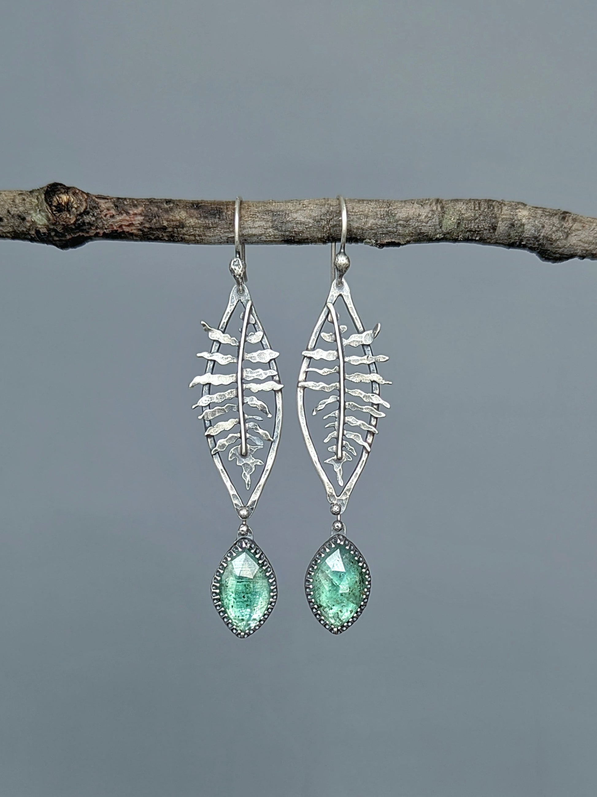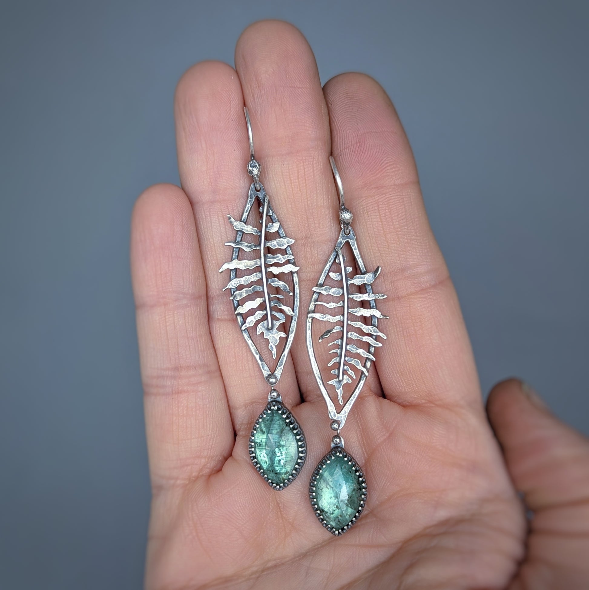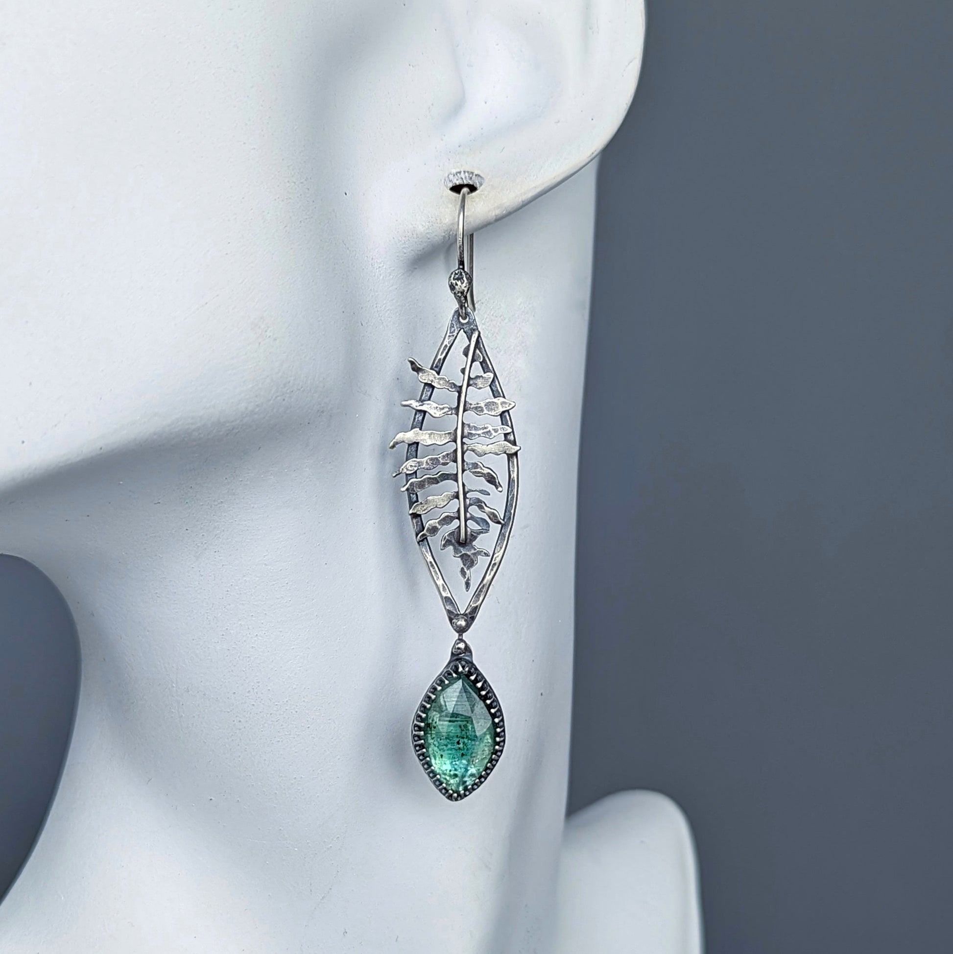 Two shimmering, faceted, green kyanite gemstones in a rare cut adorn a pair of handcrafted sterling fern leaves in marquise frames. I fabricated the ferns from sheet metal and wire- sawing, engraving, soldering, polishing, and texturing each delicate leaf.