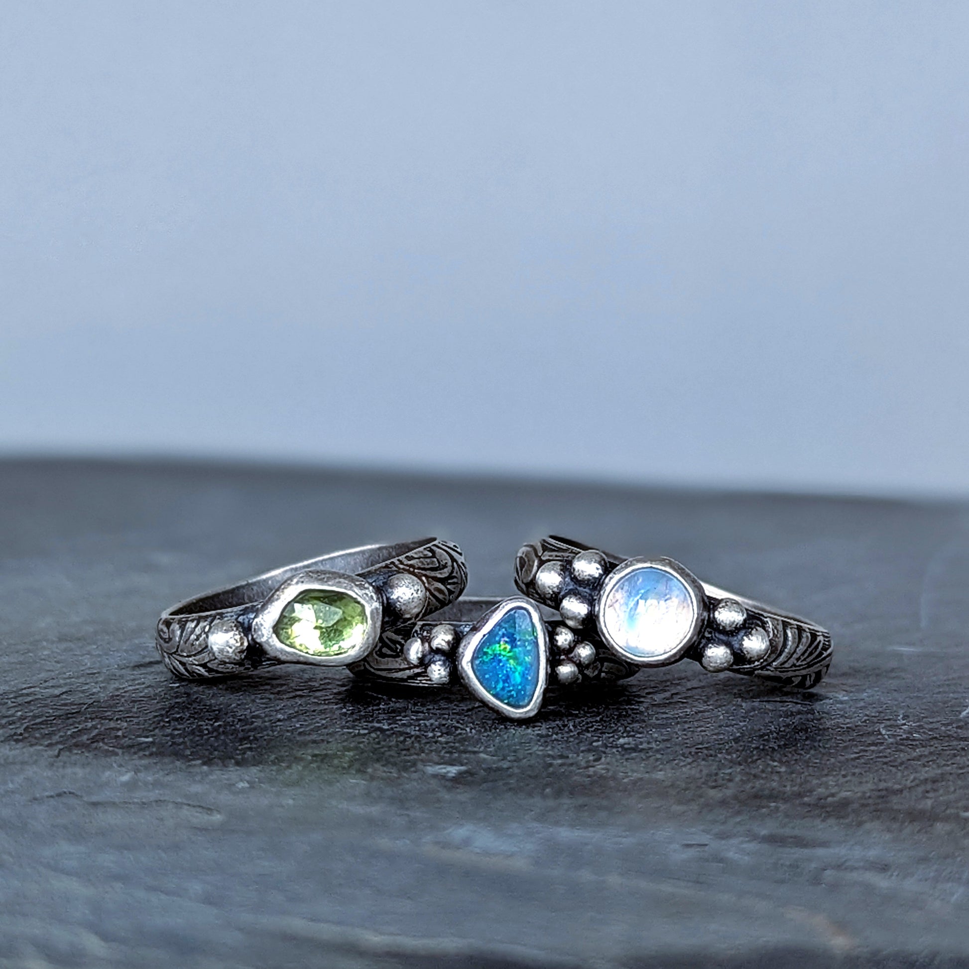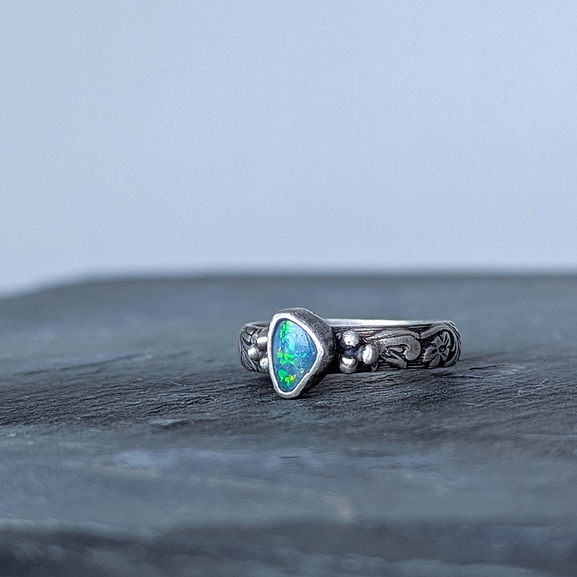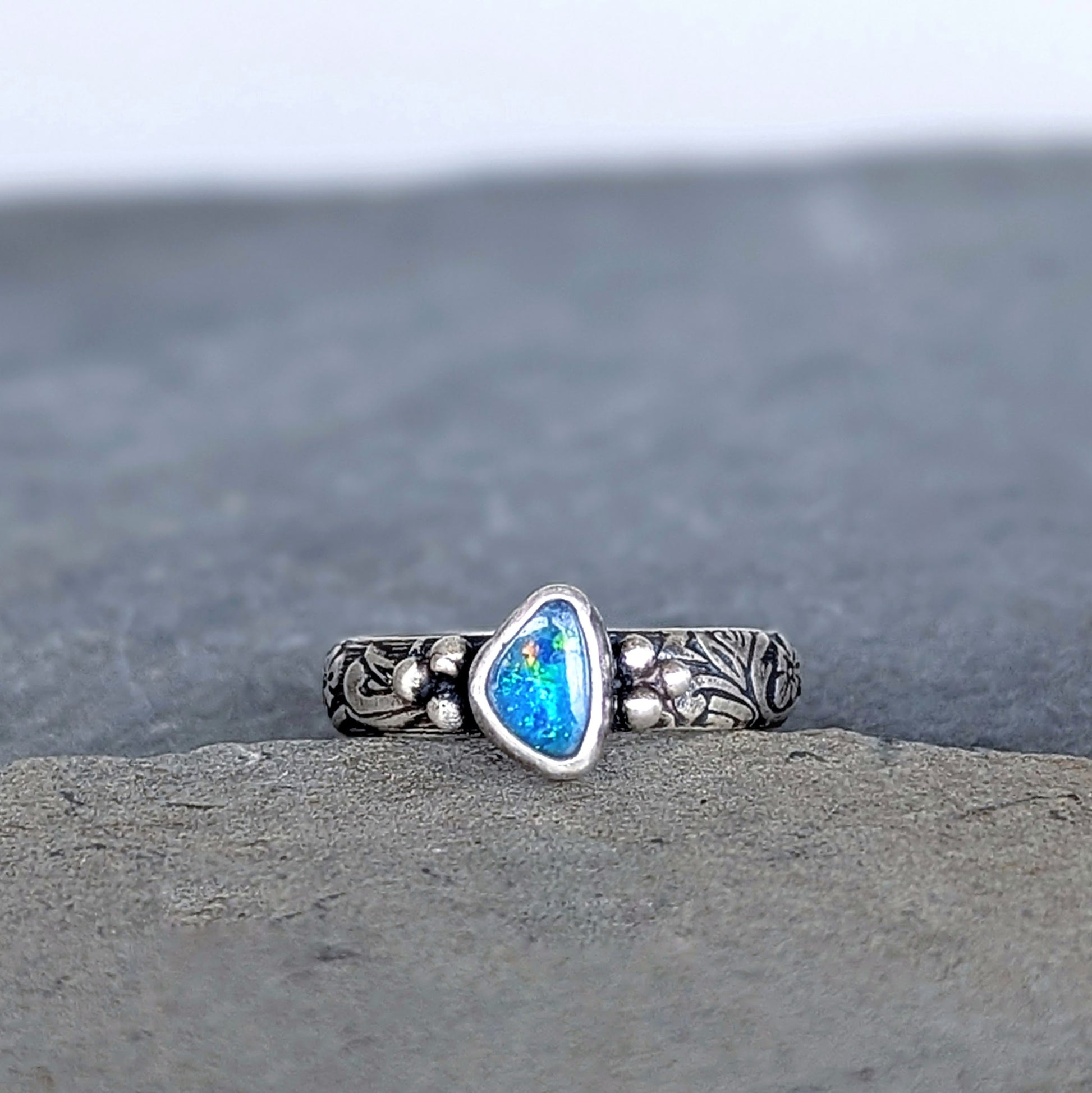 I've set a dainty, high grade Australian Opal with bright blue flash on a solid sterling silver 1/4 inch band with an art nouveau floral pattern and hand forged sterling accents. This ring is absolutely perfect for opal lovers who enjoy delicate, dainty jewelry.