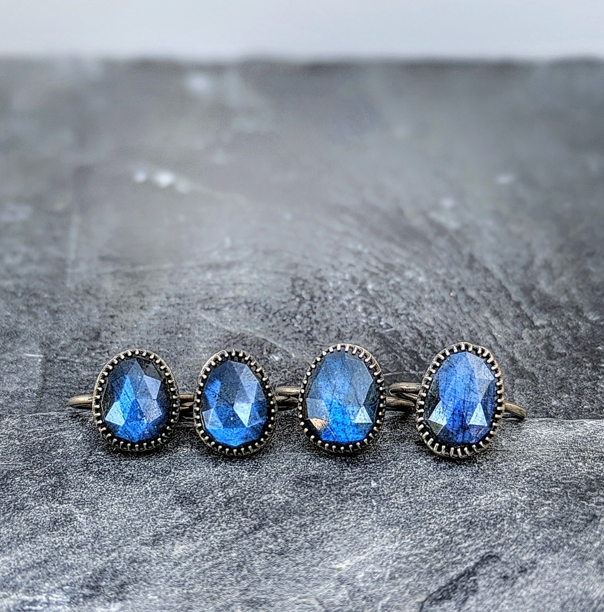 These rings feature deep blue rose-cut labradorite gemstones, their faceted surfaces catching flashes of indigo and violet with every movement. Set simply in sterling silver, the stone’s natural glow is the star- luminous yet understated, mysterious yet timeless. Everyday talismans of intuition and inner light.