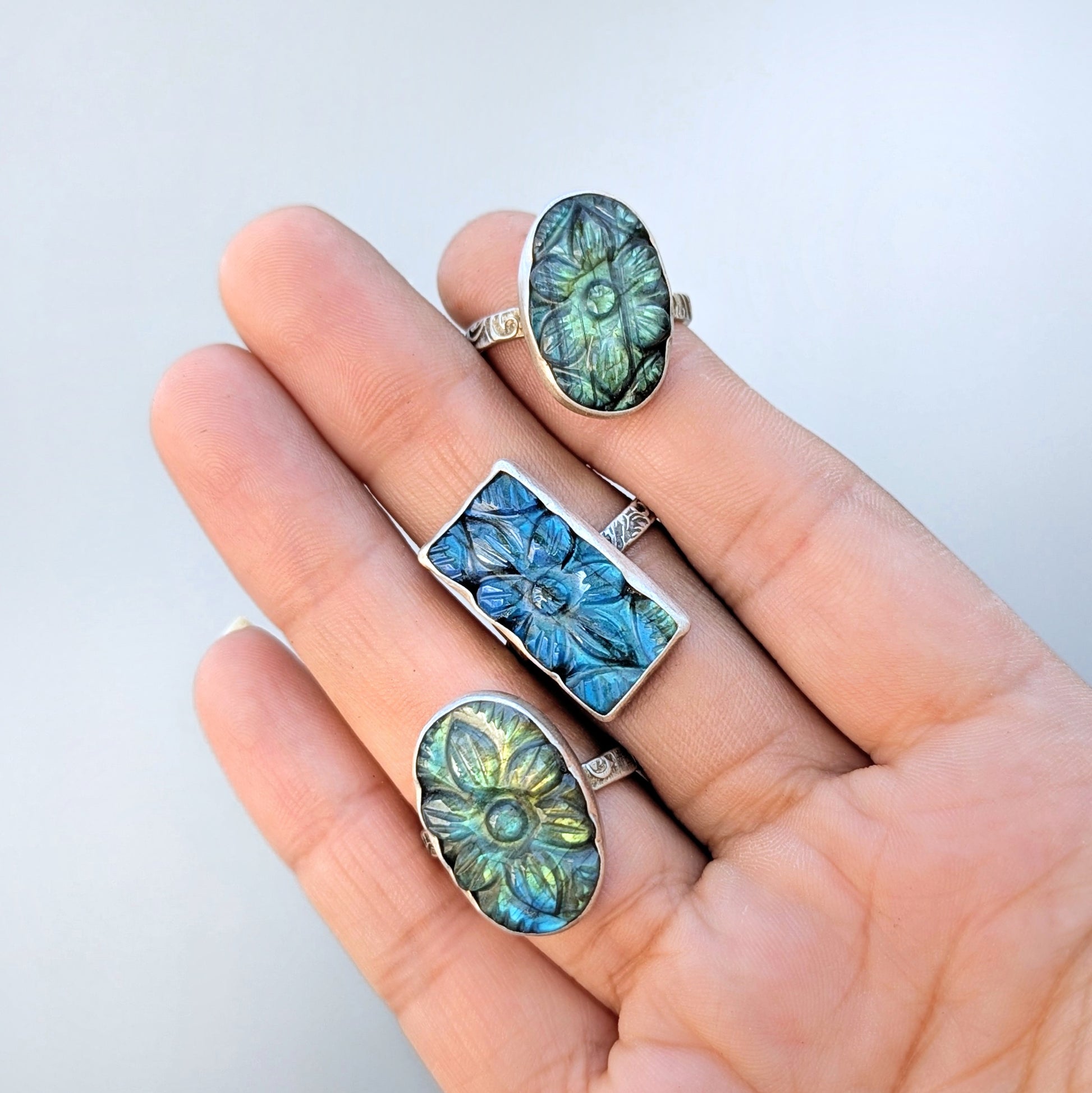 From the Aurora Bloom Collection- a celebration of light, nature, and transformation- this petite ring features a rare, hand-carved labradorite gemstone alive with shifting shades of blue and green. Each gem is individually carved with delicate botanical motifs, making every piece one of a kind.