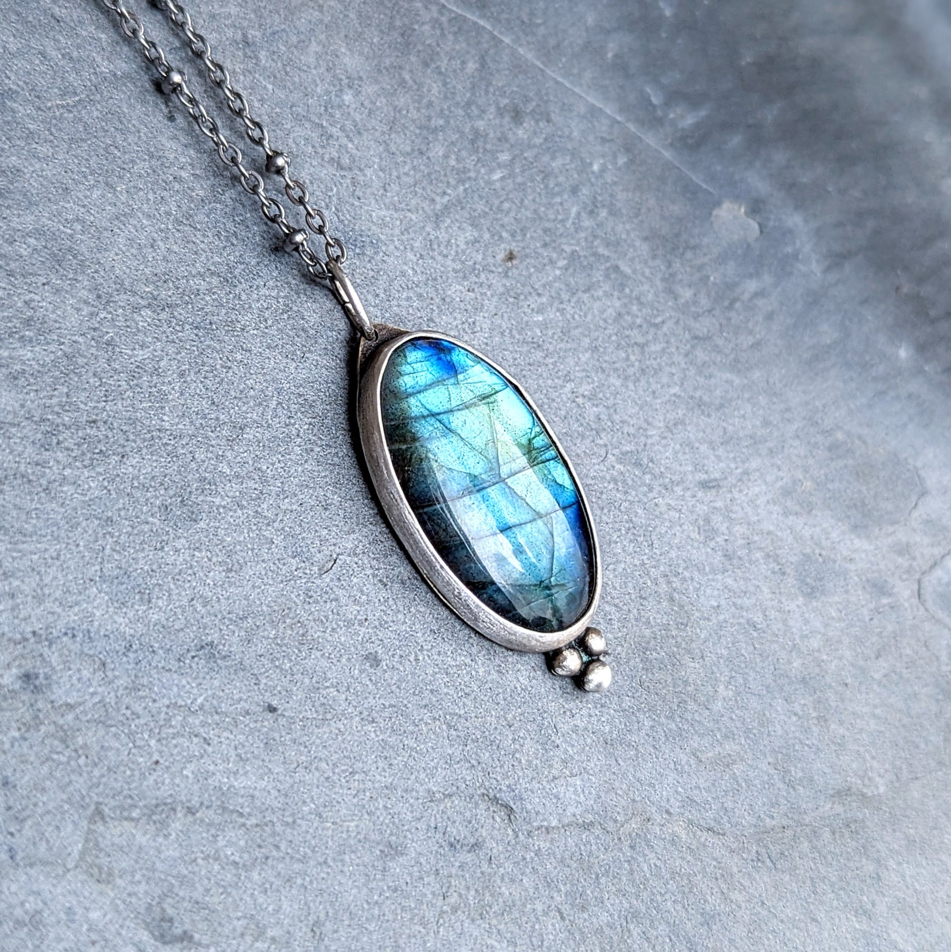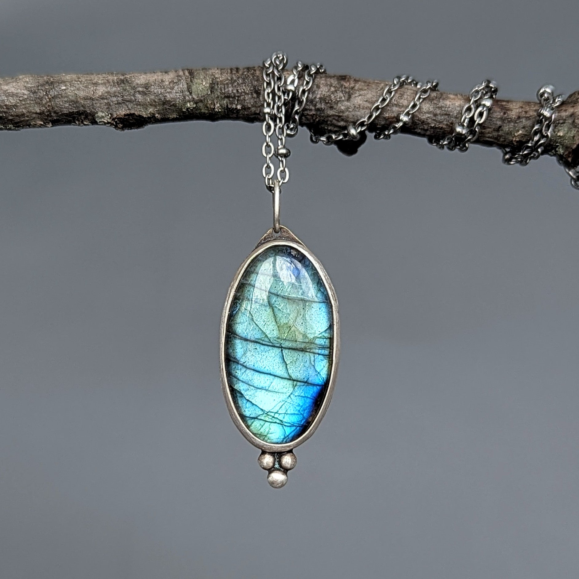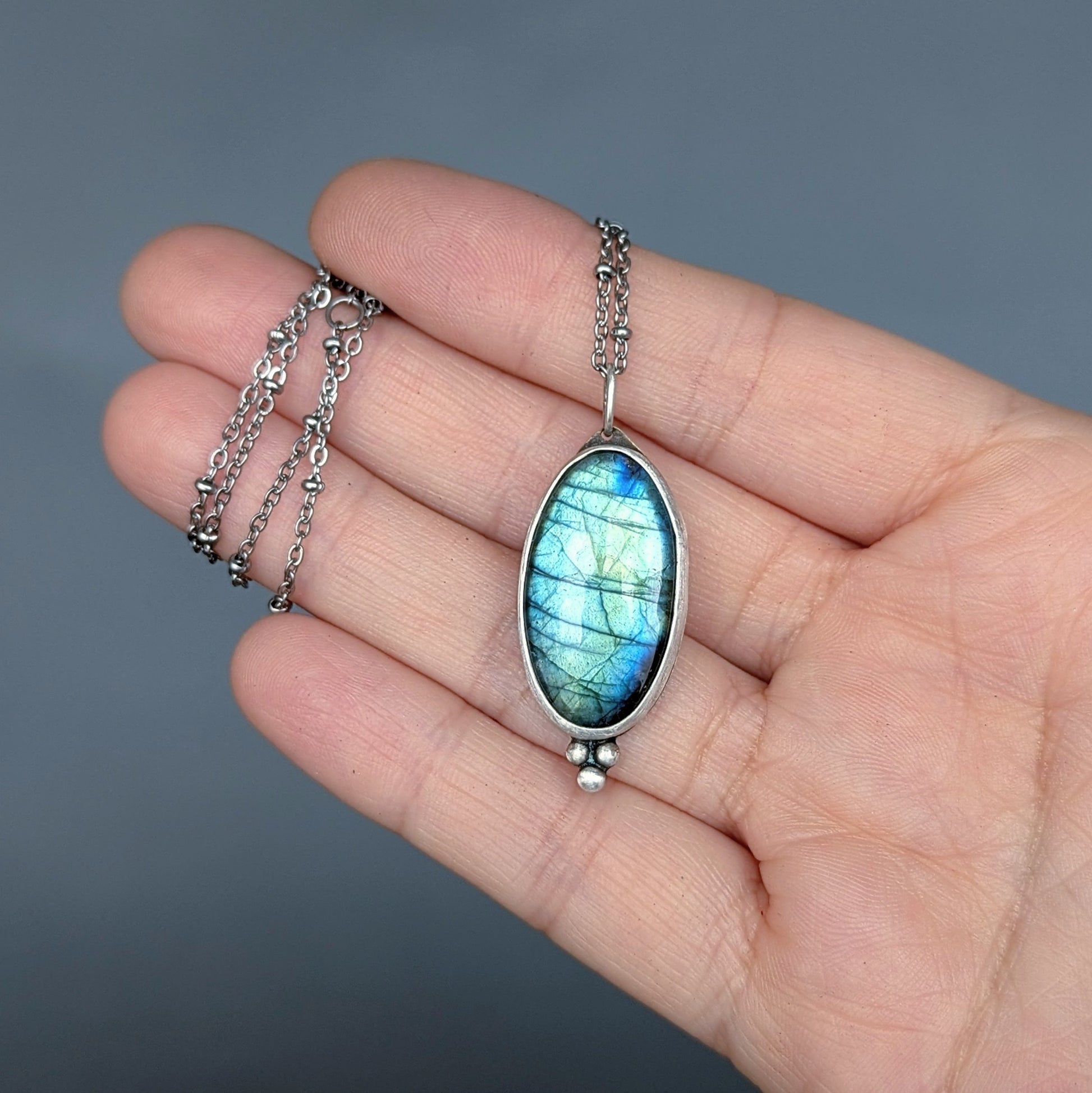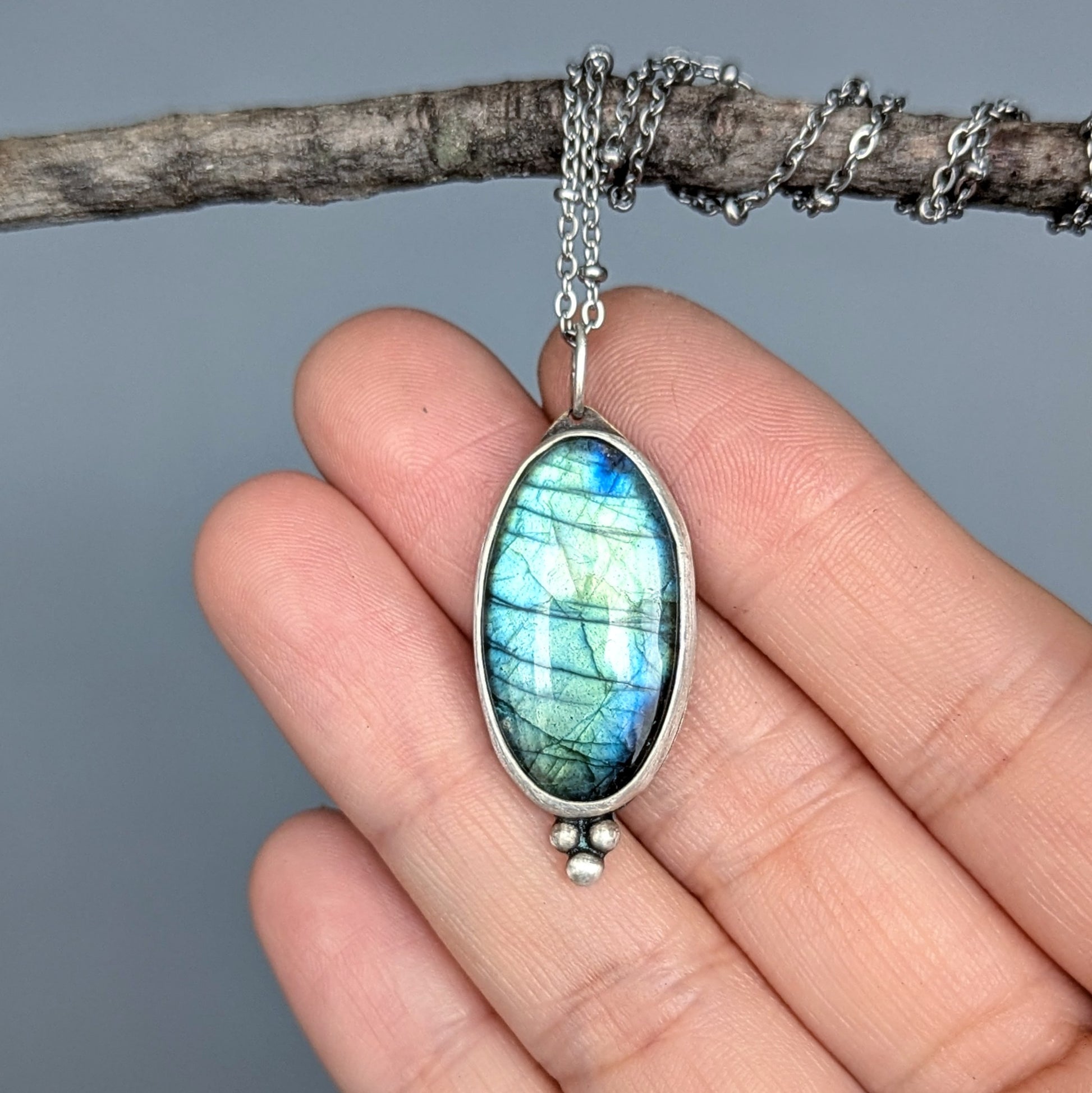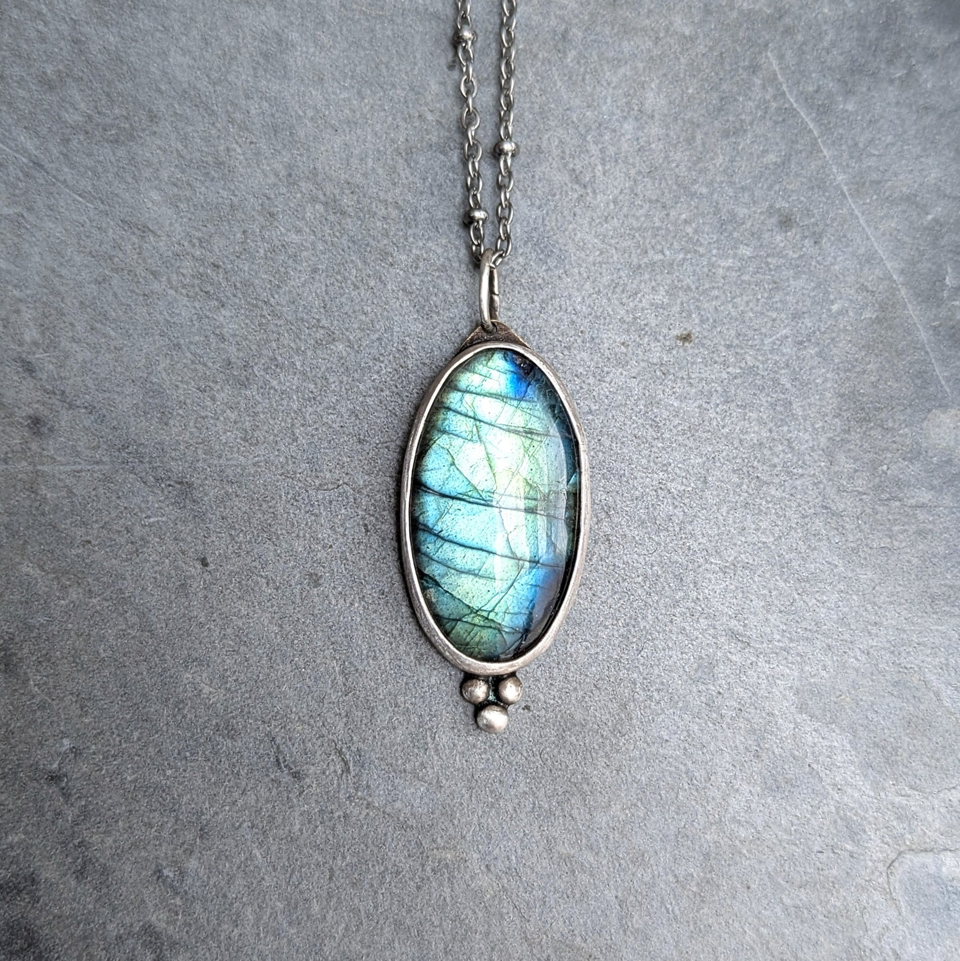 The pendant itself measures 1.5 inches long, and it hangs from a delicate stainless steel dot chain, adjustable at 18 and at 20 inches. If you need a different length, please let me know in the notes at checkout!