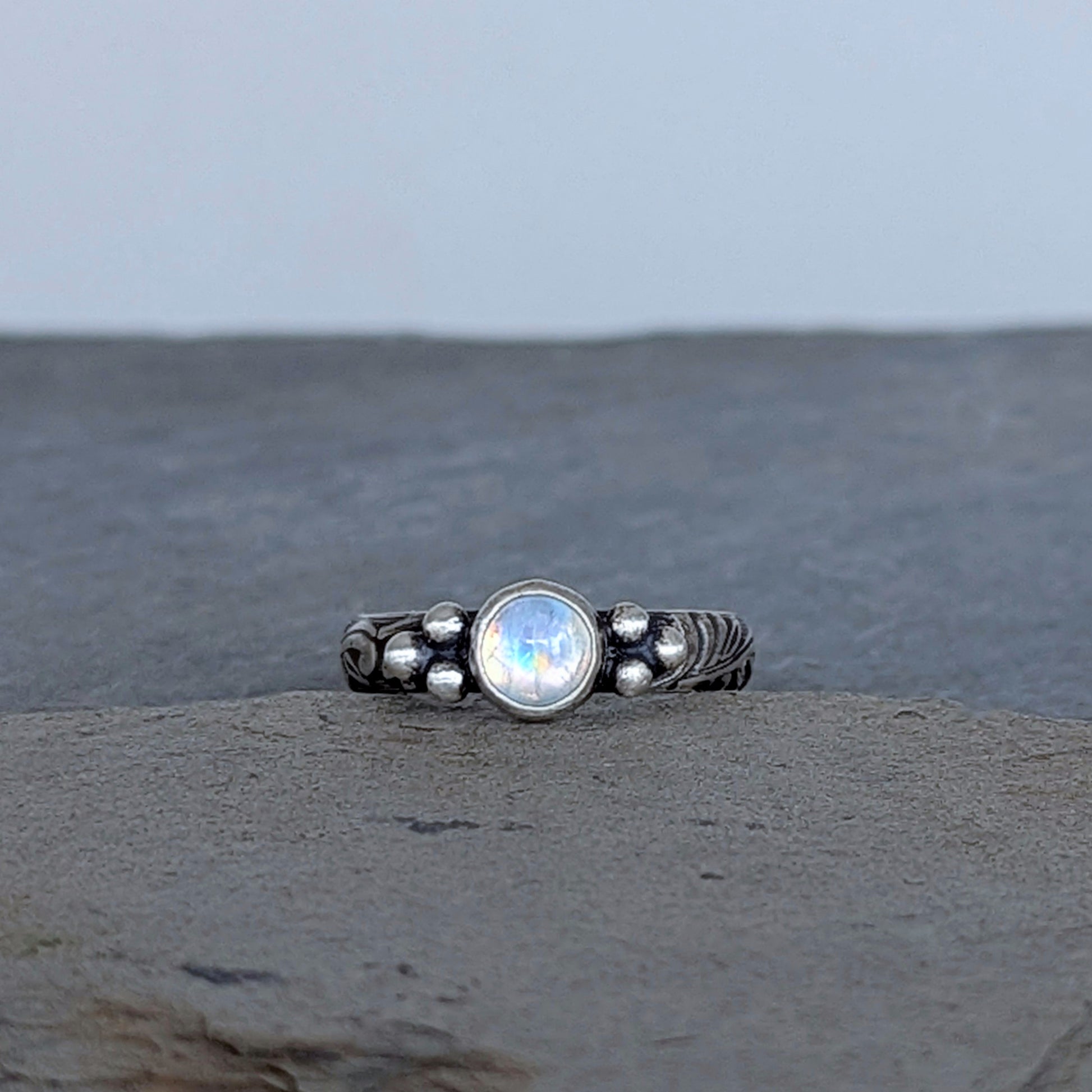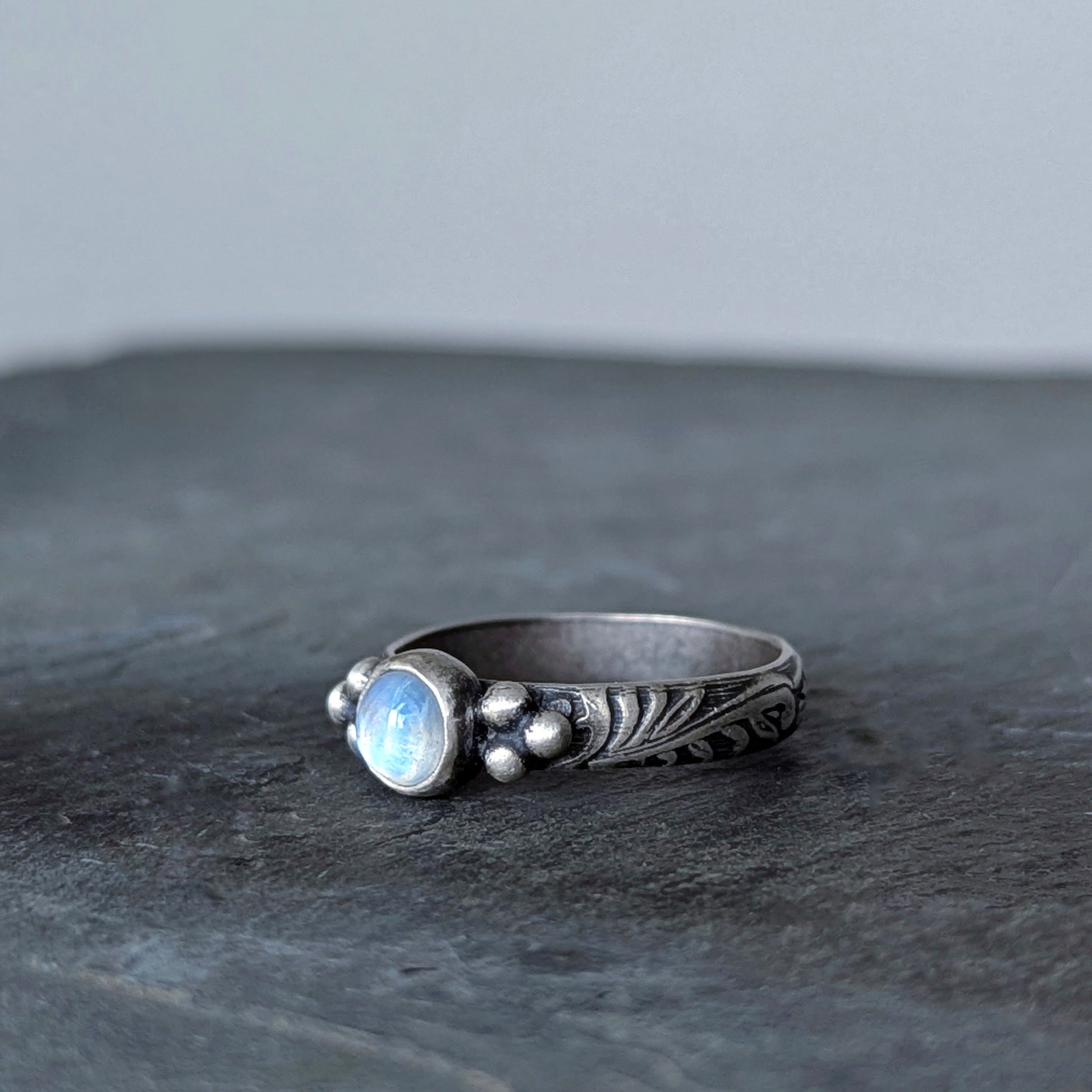 I've set a dainty, high-grade glowing moonstone gem on a solid sterling silver 1/4 inch band with an art nouveau floral pattern, and added hand forged sterling accents. This ring is absolutely perfect for moonstone lovers who enjoy delicate, dainty jewelry.