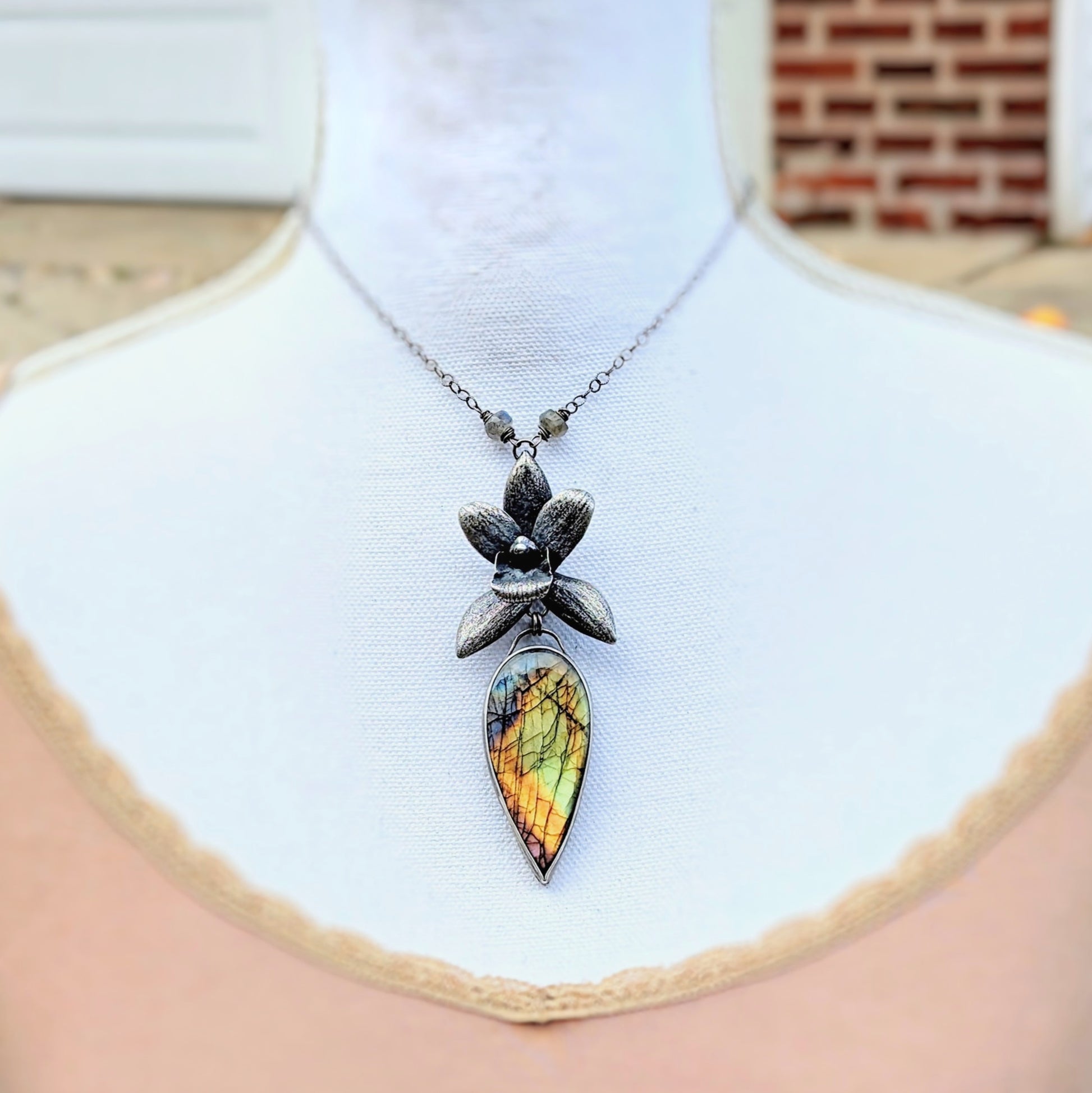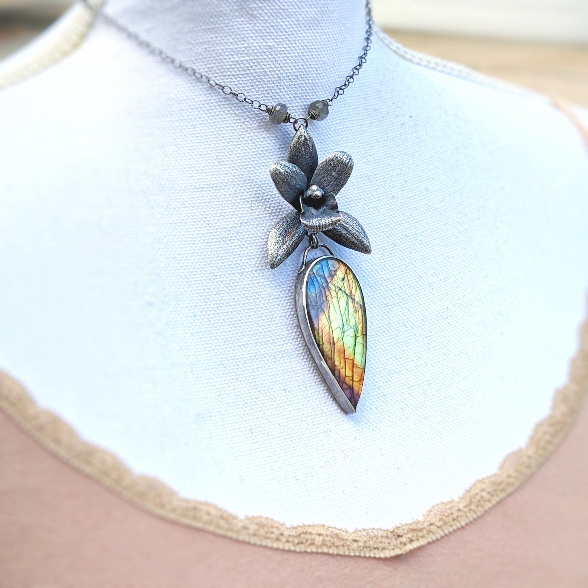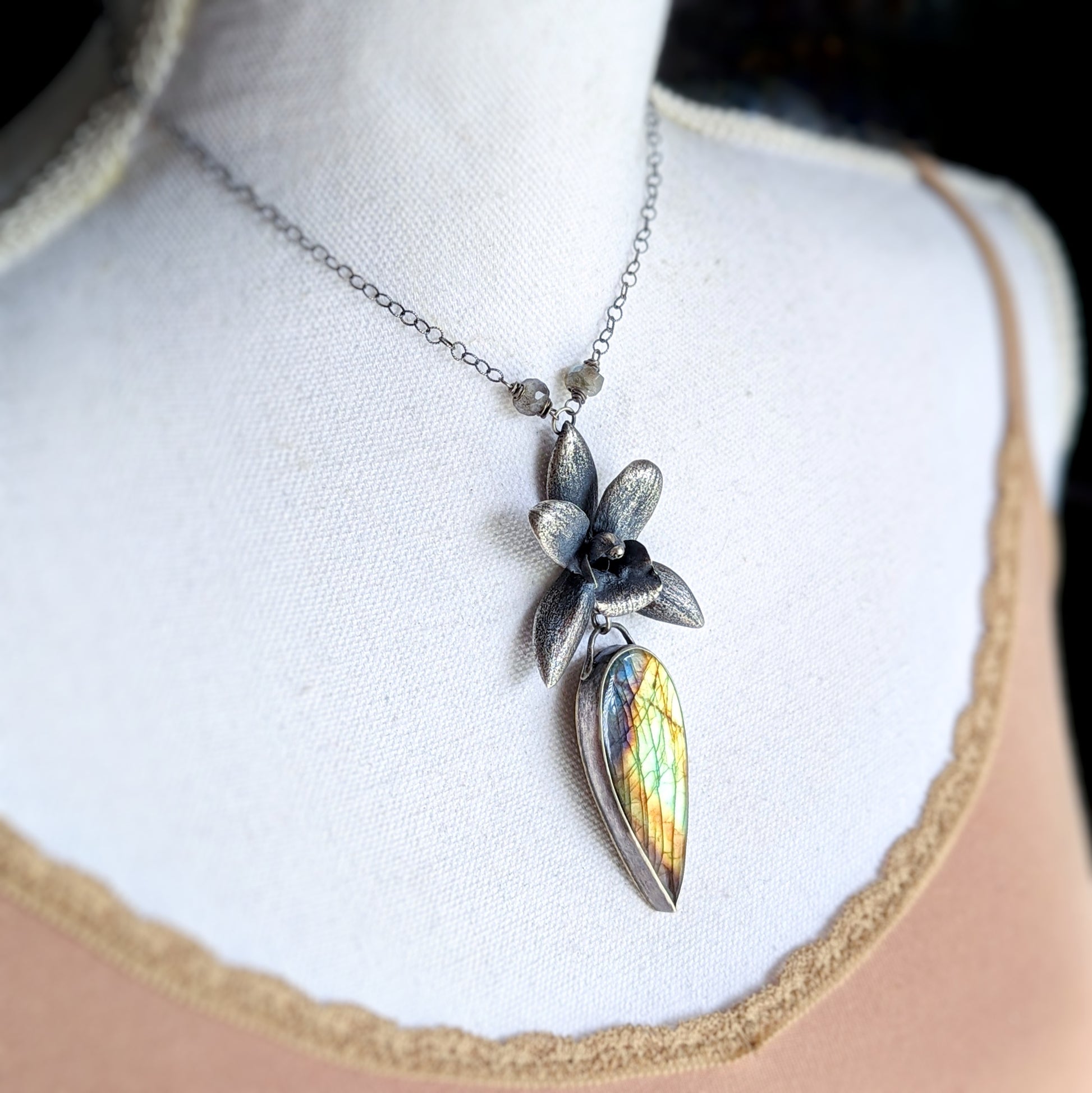 Enchanted Orchid- a solid sterling silver orchid and rainbow labradorite statement necklace
