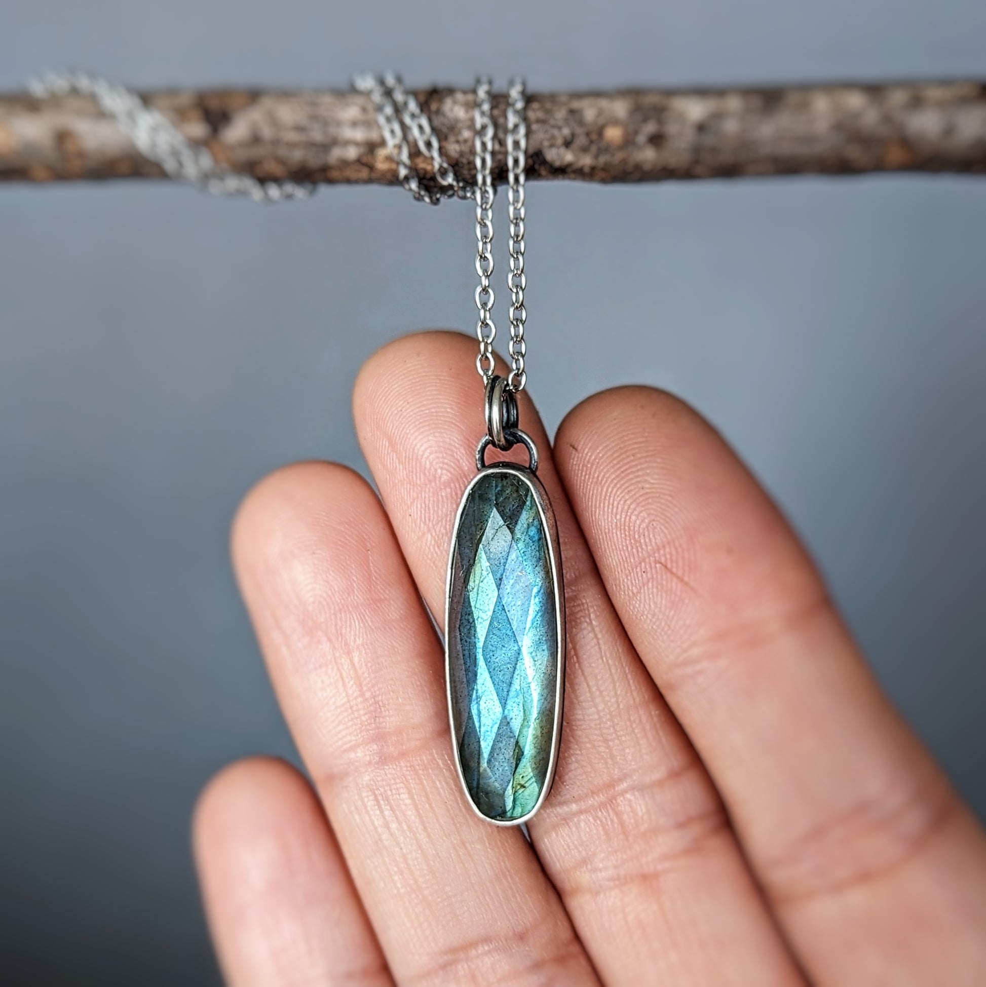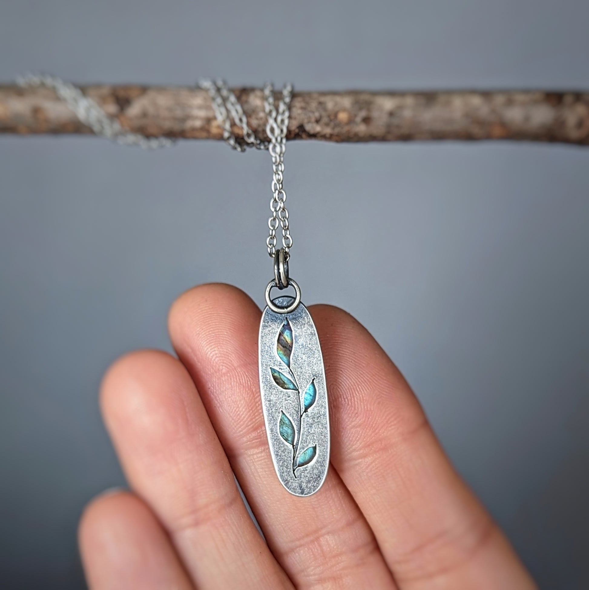 I've set a flashy faceted labradorite gem in sterling silver, with a sweet little hand-sawn botanical peekaboo accent on the back.