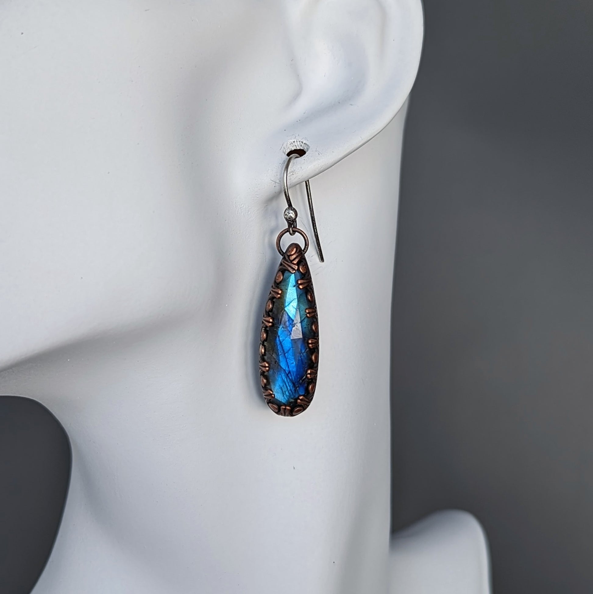 I've set two beautiful faceted blue labradorite gemstones in delicate copper filigree, and finished them with hand forged sterling ear wires.