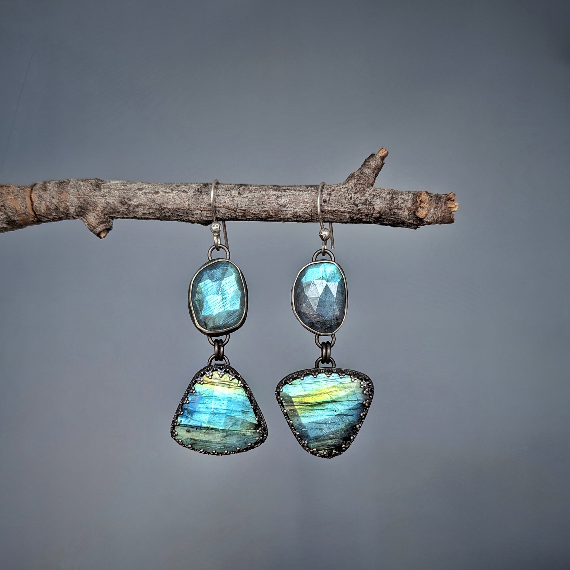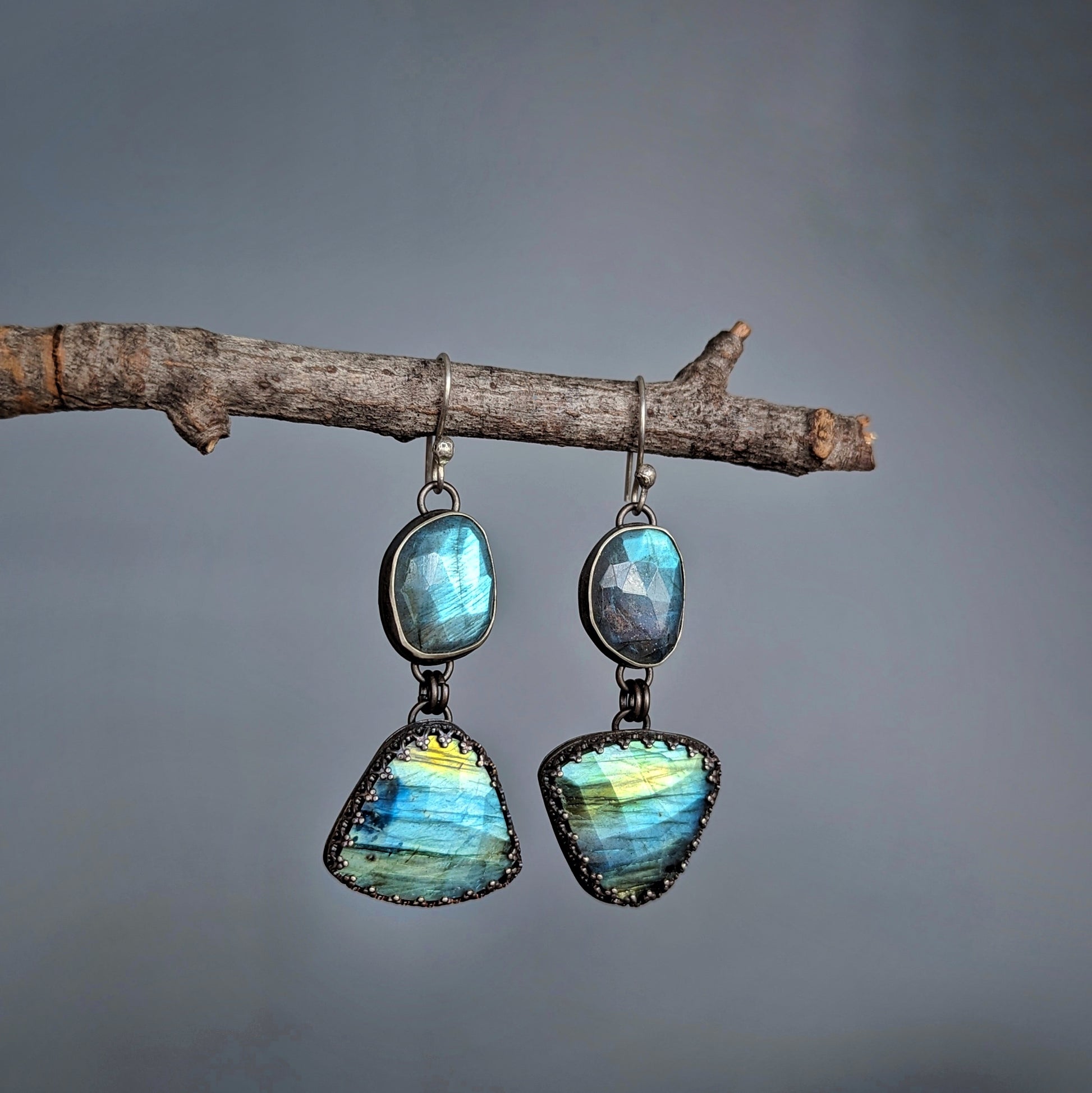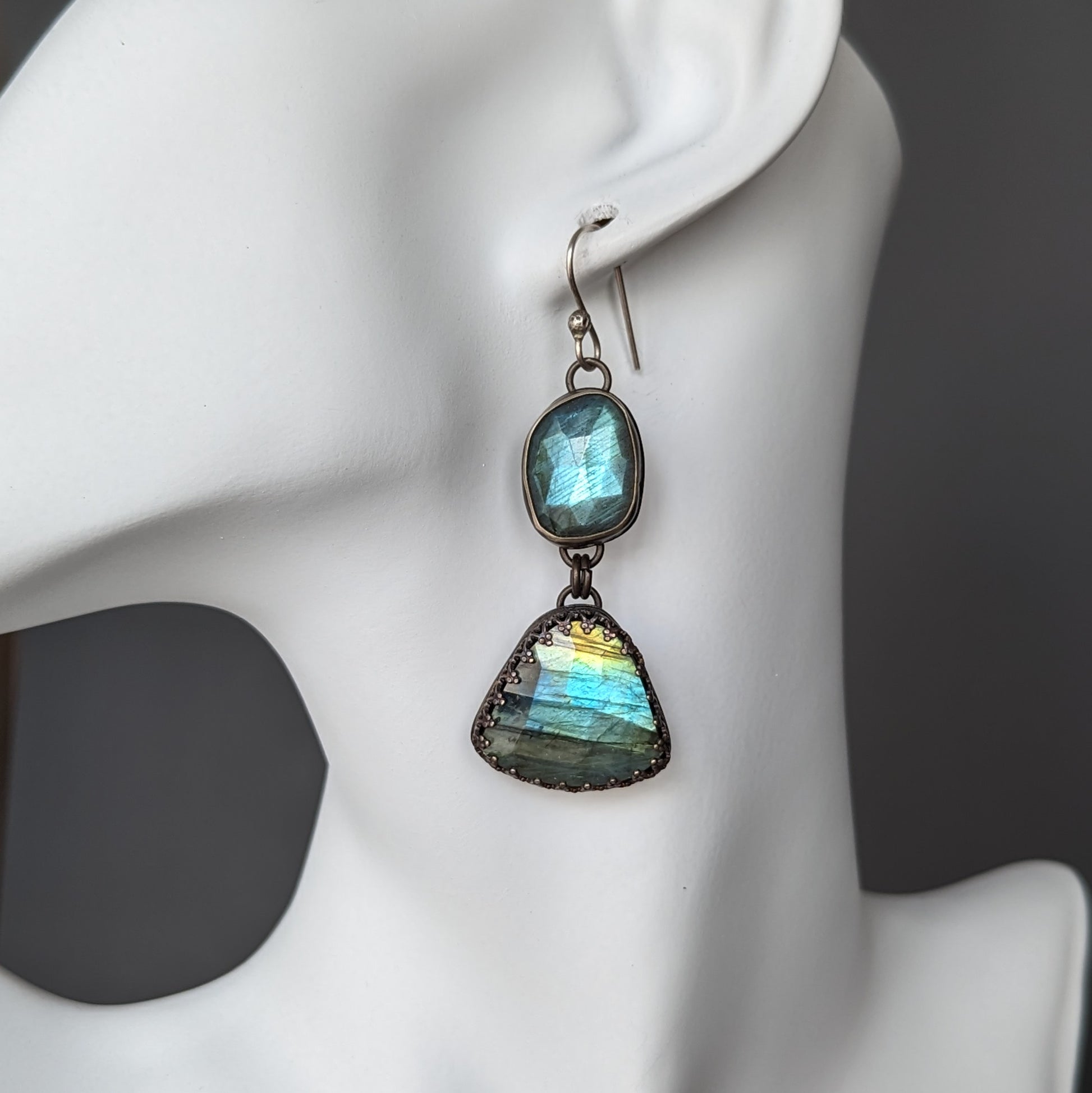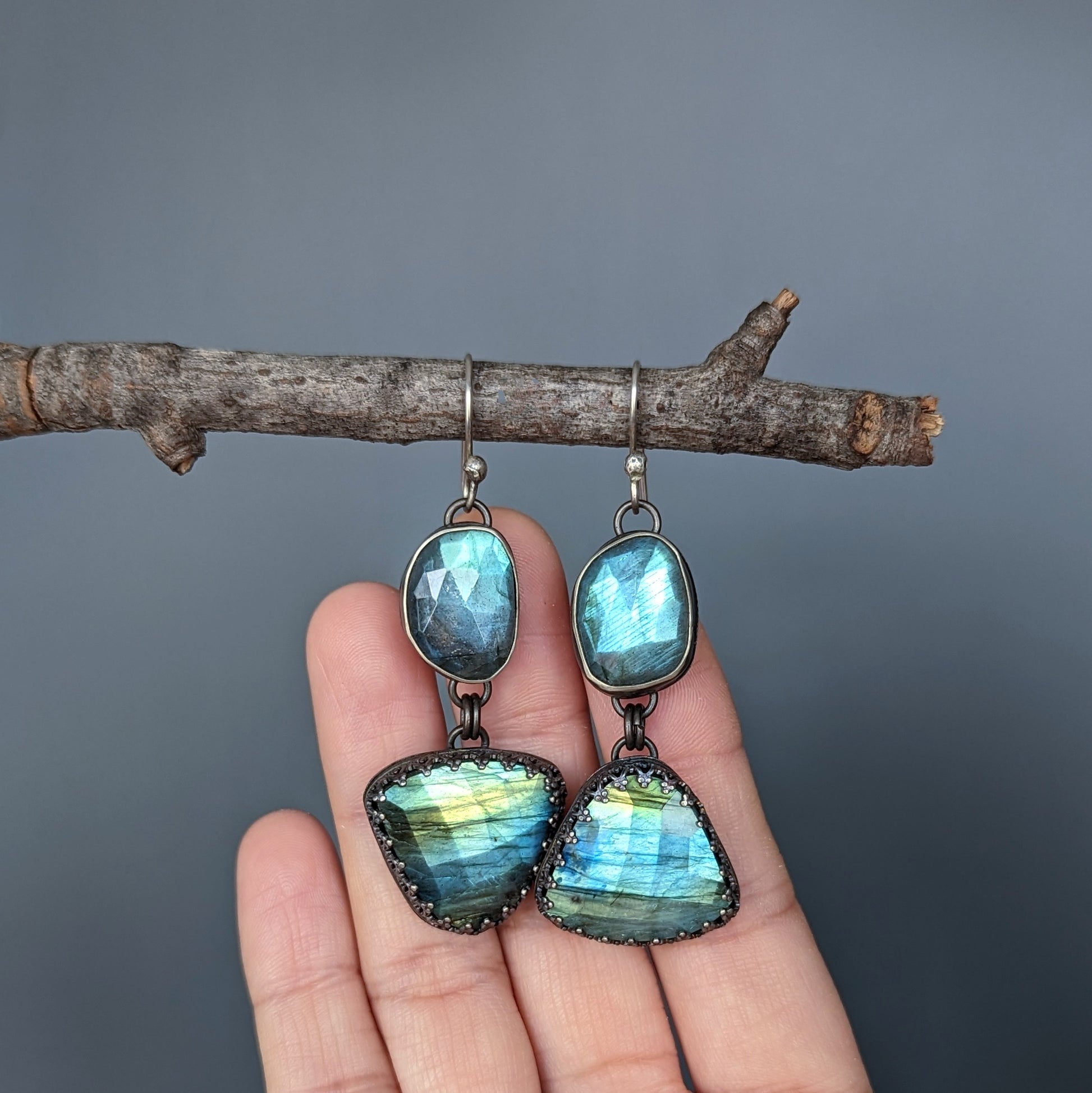 Flashy faceted aqua labradorite gemstones have been set in sterling silver filigree bezels.