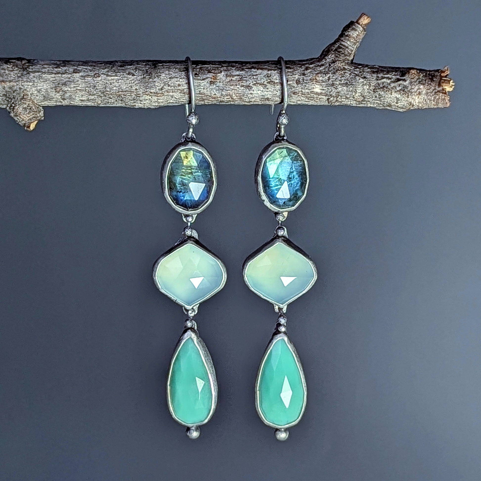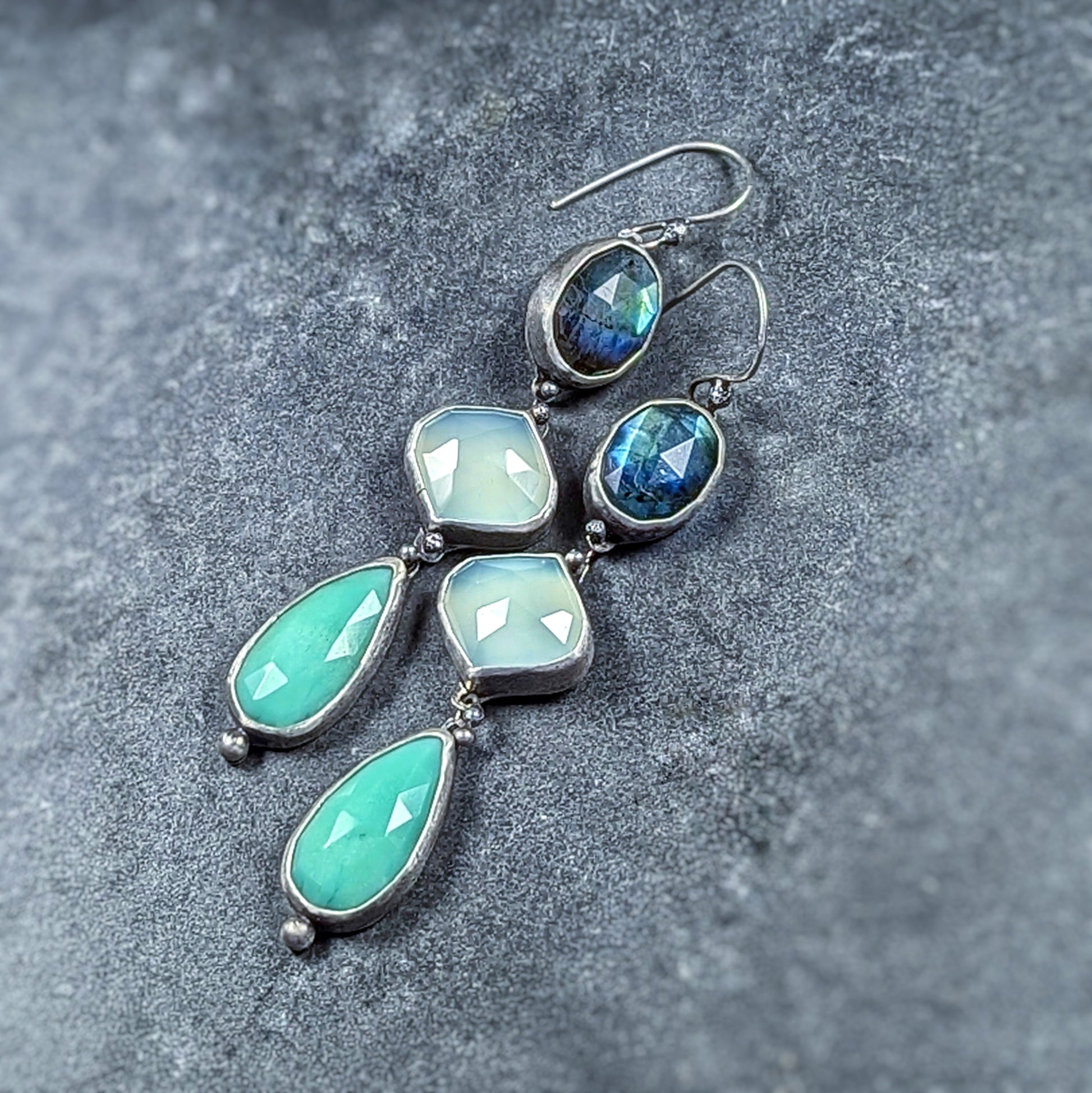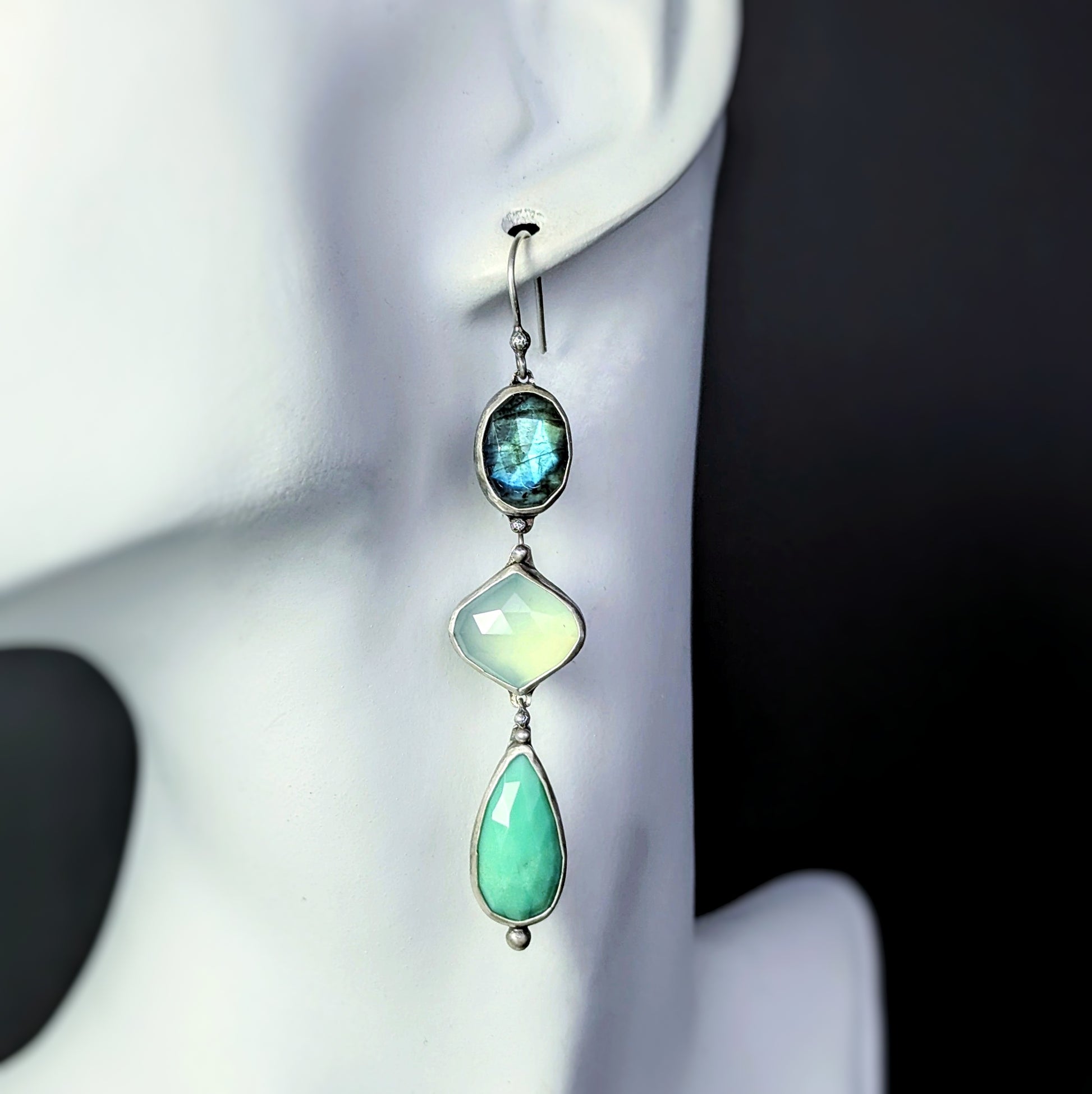 Fata Morgana: Sterling Silver and Gemstone Artisan Cascade Earrings with Labradorite, Chrysoprase, and Chalcedony