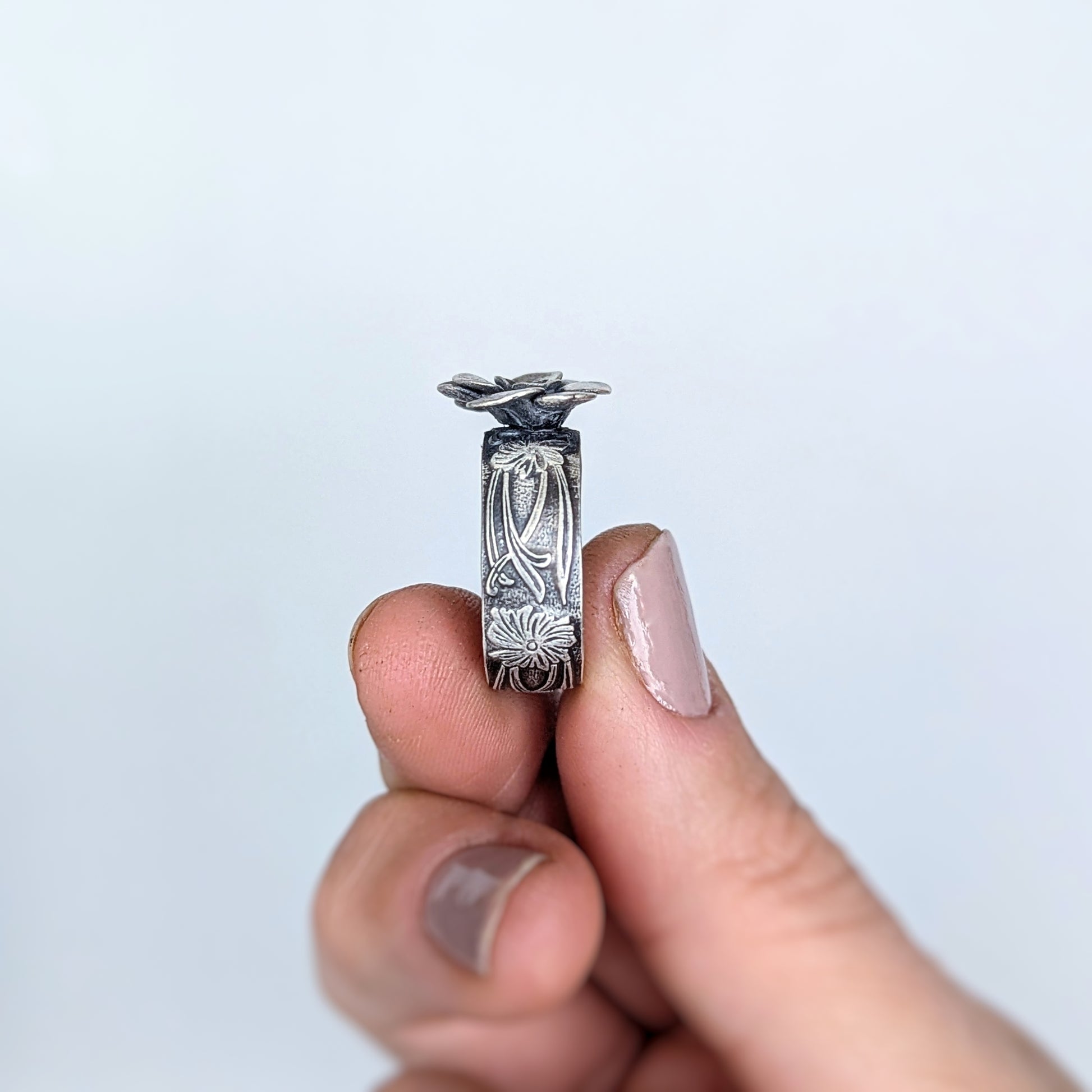 I've set it on a 1/4 inch solid sterling silver band with an embossed art nouveau floral pattern. Wear it as a reminder of the serenity that awaits in the quiet moments, when the beauty of the natural world is all that's needed.