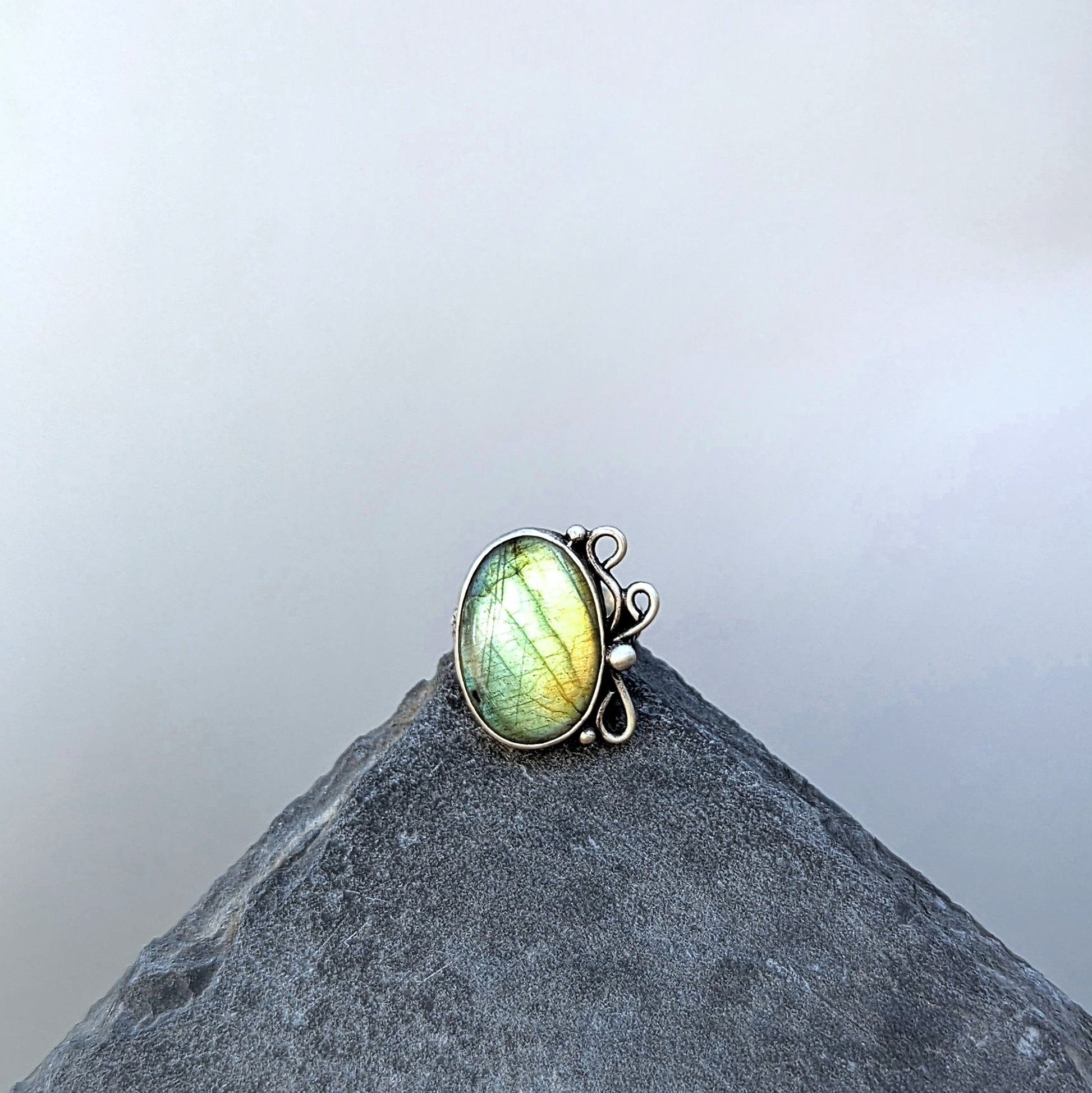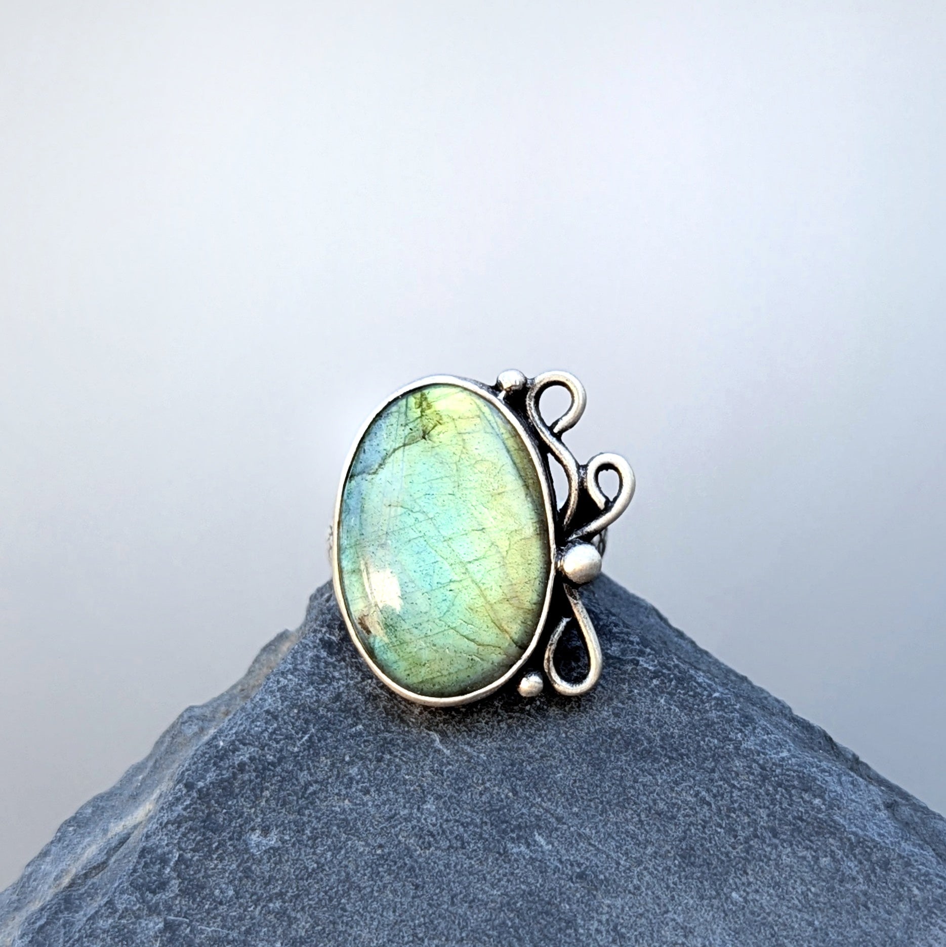 From the Flourish Collection, this statement ring features a luminous minty green labradorite that shines from every direction.