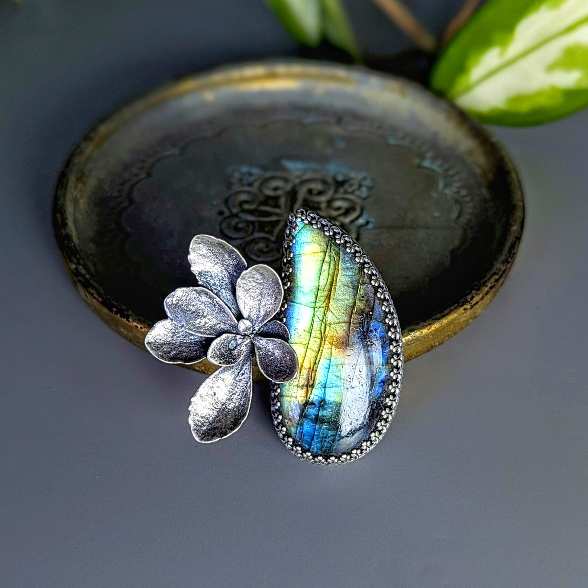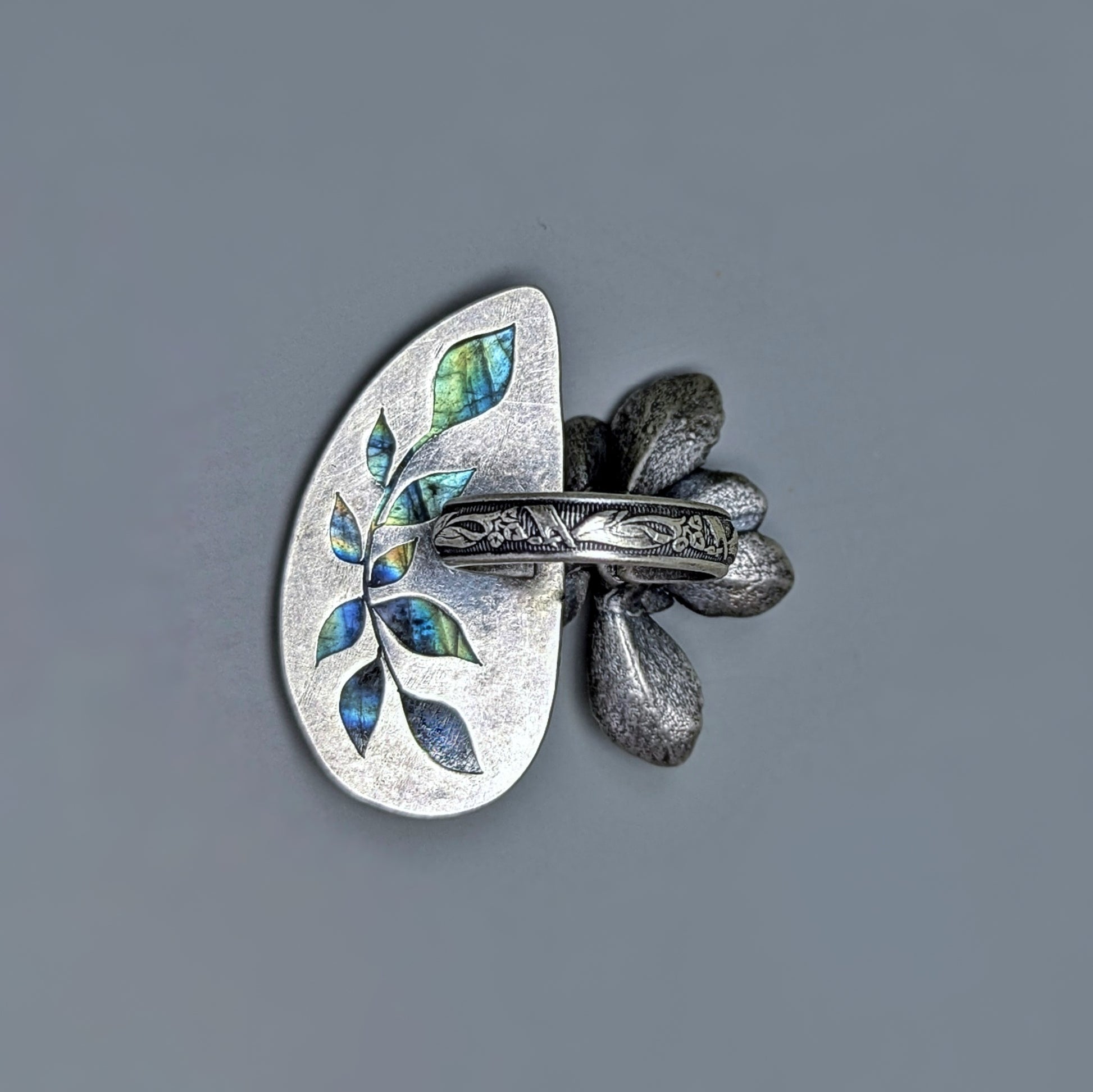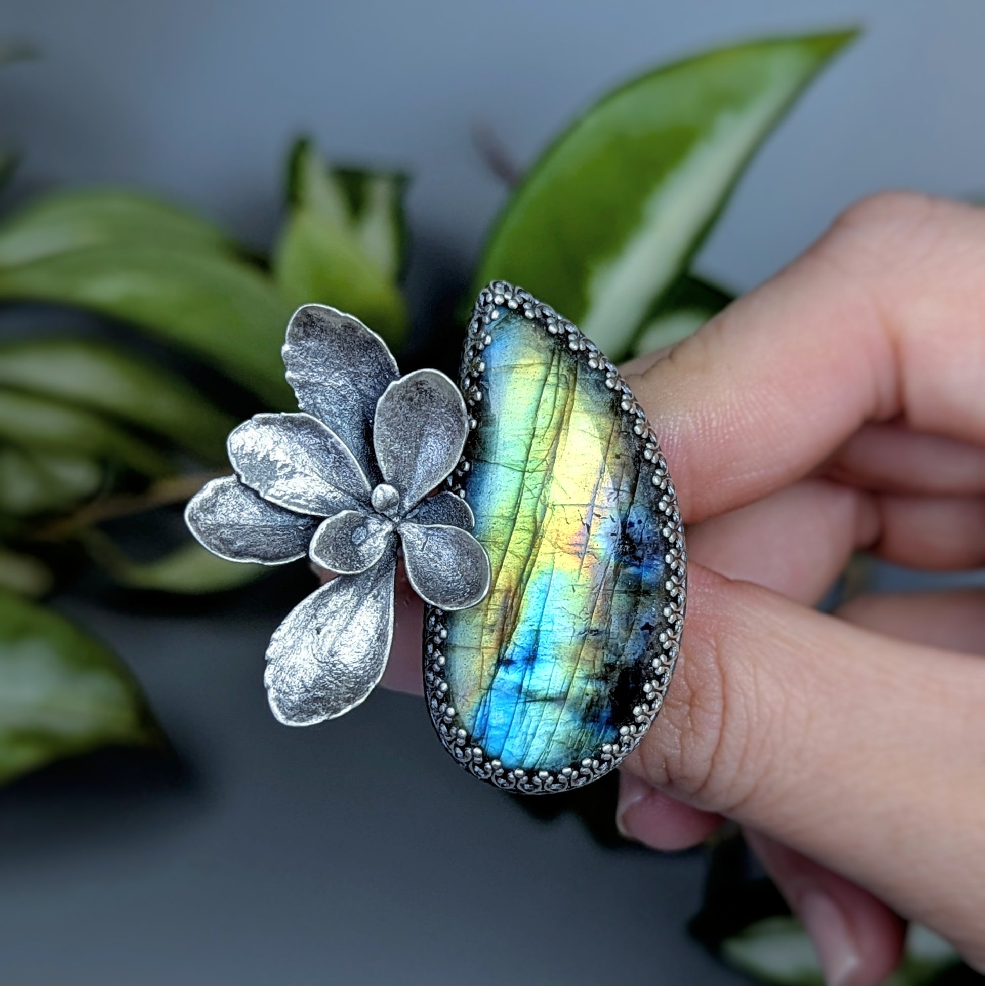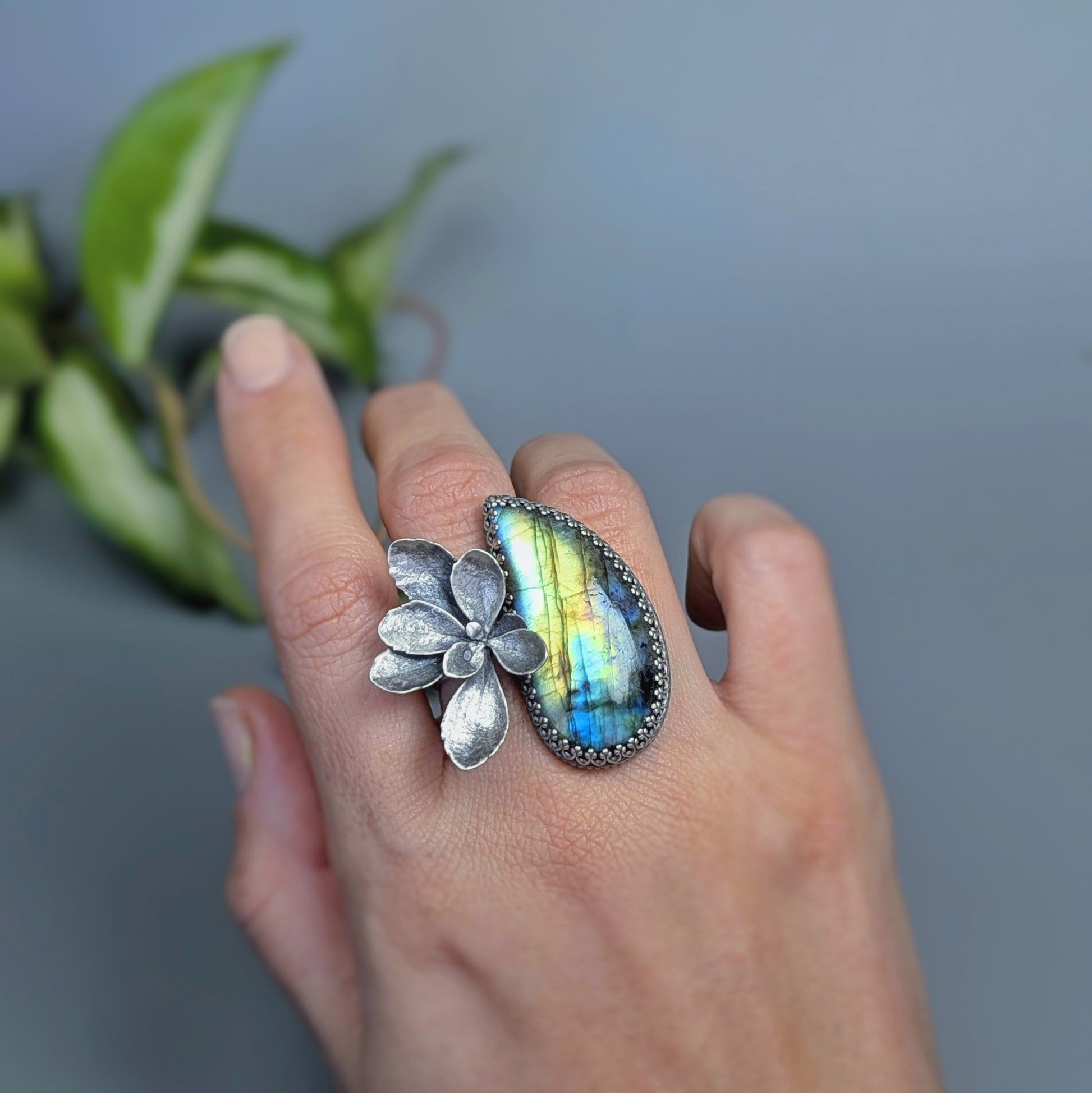 Gemmaflora Maxima: Rainbow Labradorite Sterling Silver Succulent Artisan Ring