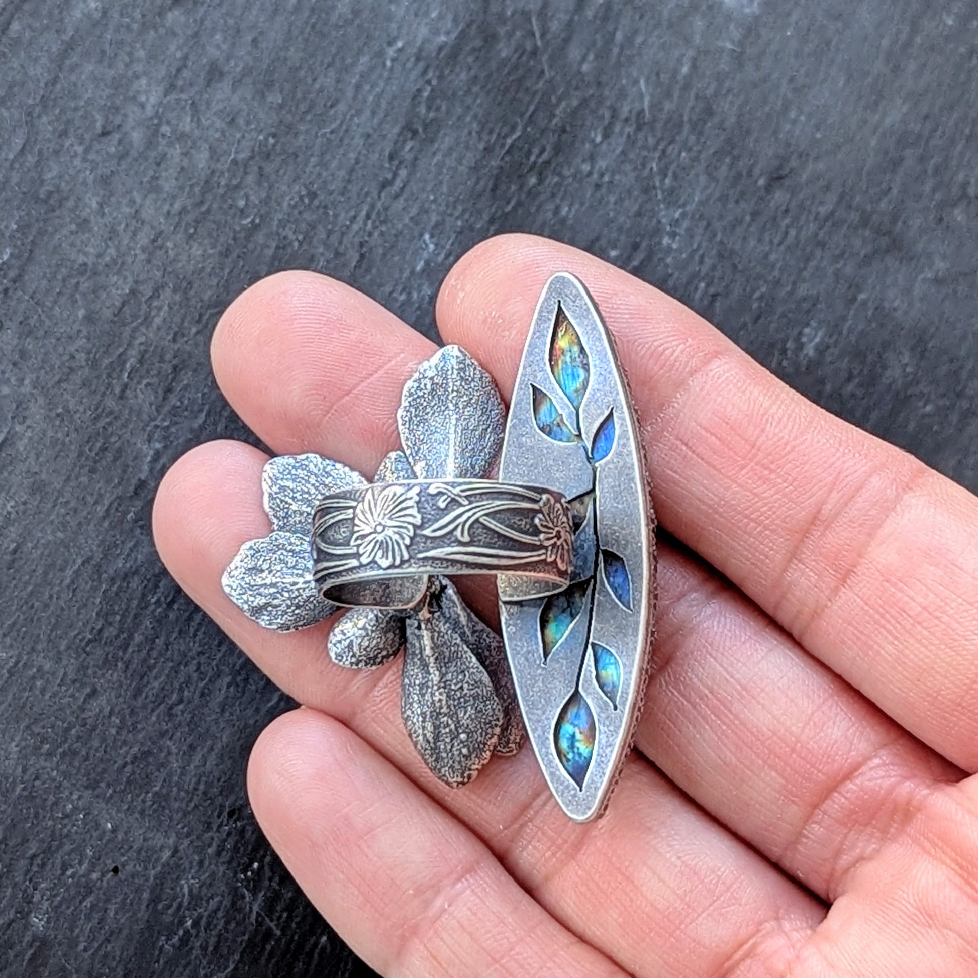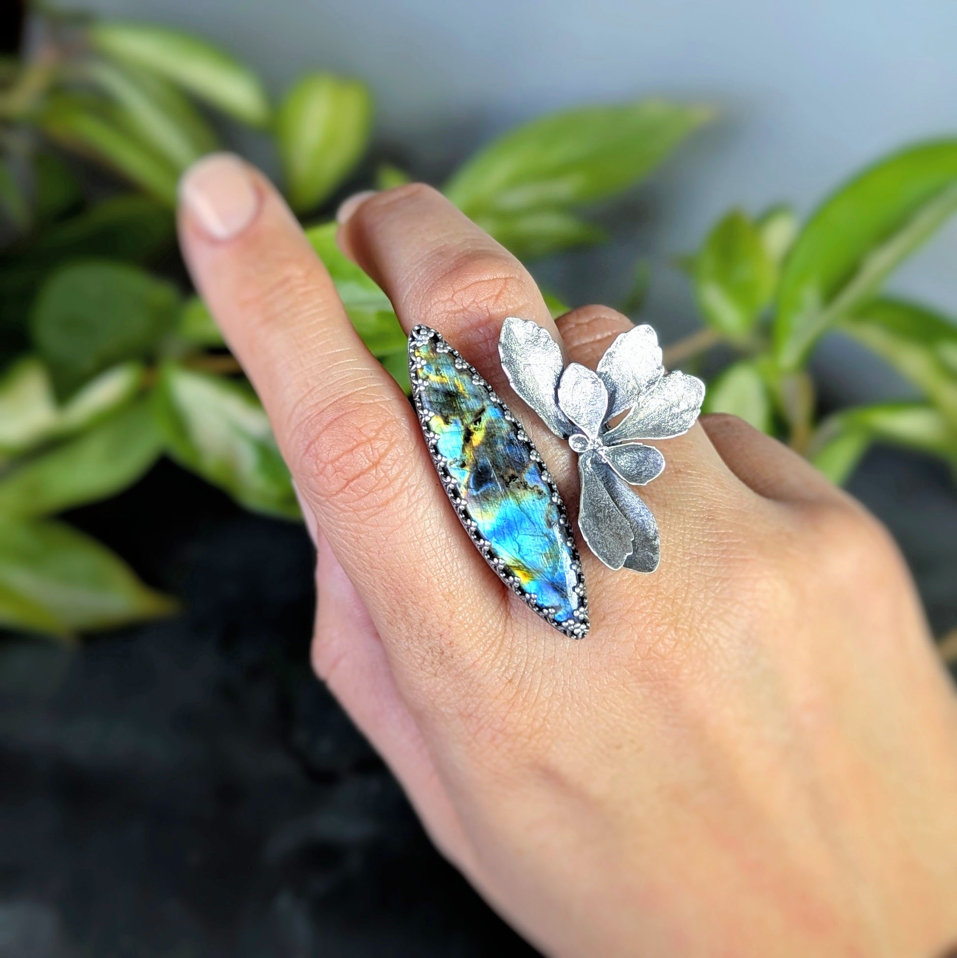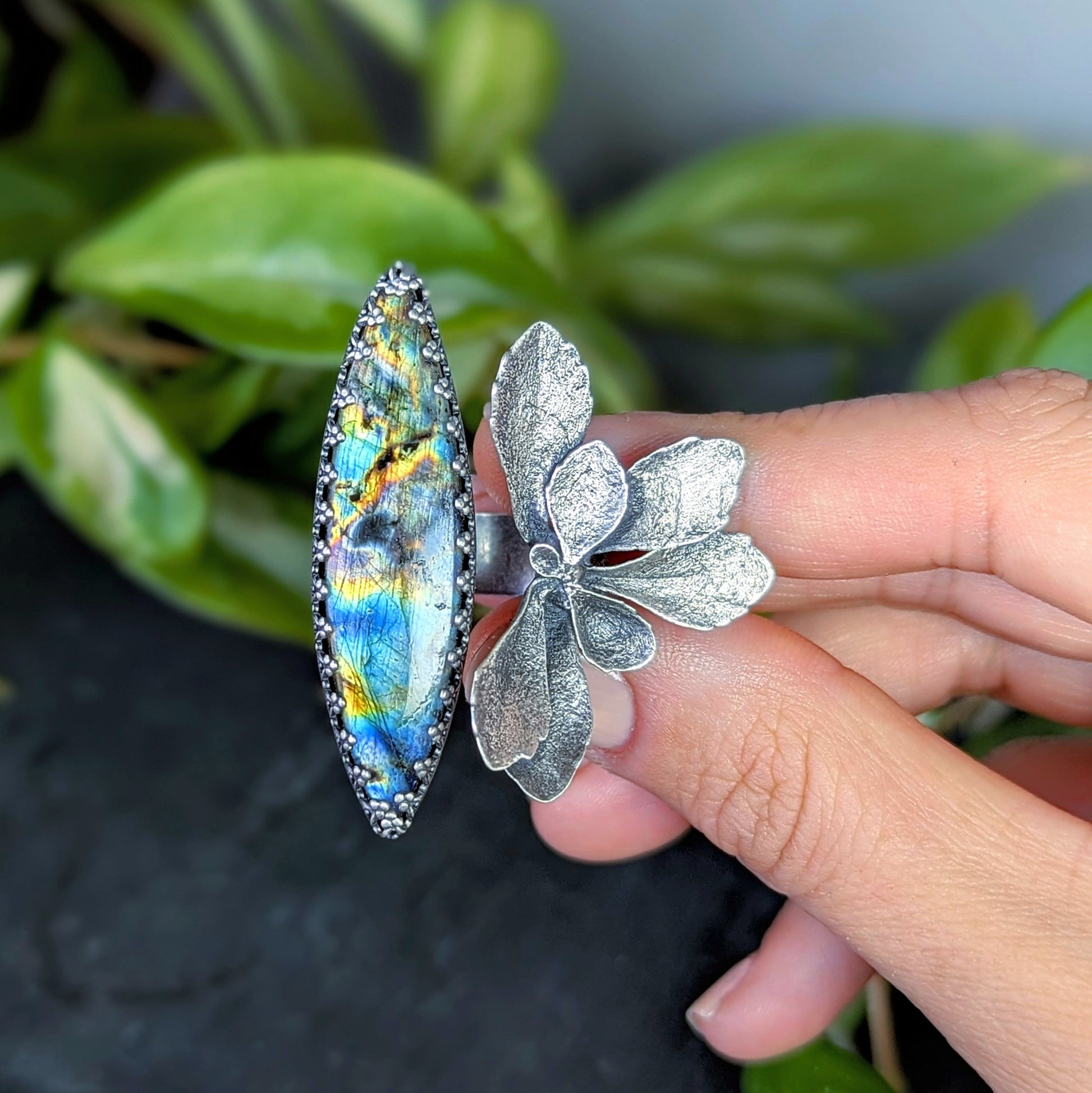 I wrapped a gorgeous, cosmic, rainbow labradorite marquise cut gemstone in an intricate sterling silver bezel with a hand pierced peekaboo back, and set it on top of 1/2" wide band with a floral art nouveau pattern. It is accented by a statement-sized genuine solid cast sterling silver succulent blossom. The combination of gemstone+ florals+ metals is one of my absolute favorites, and makes this piece totally one of a kind.