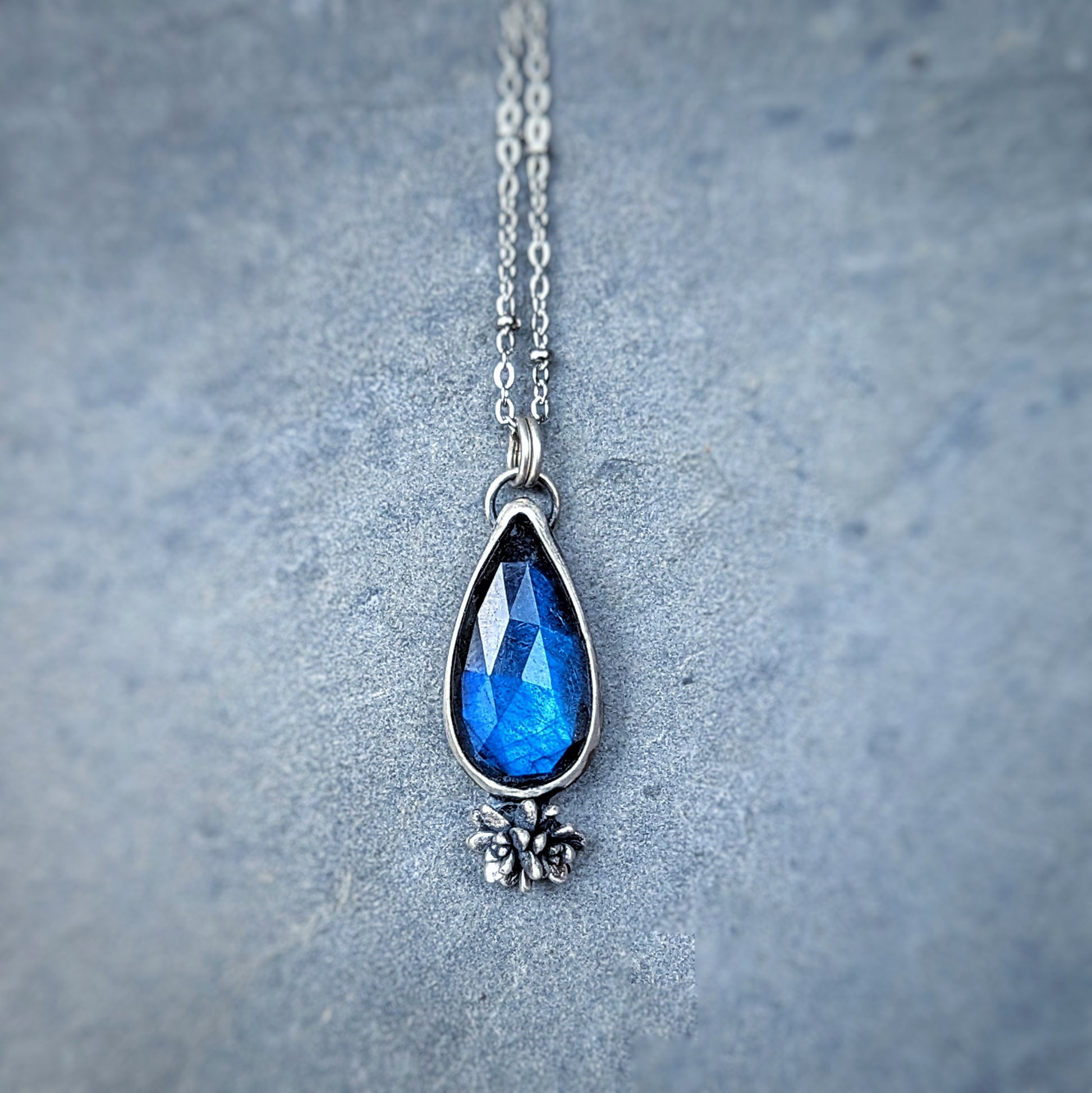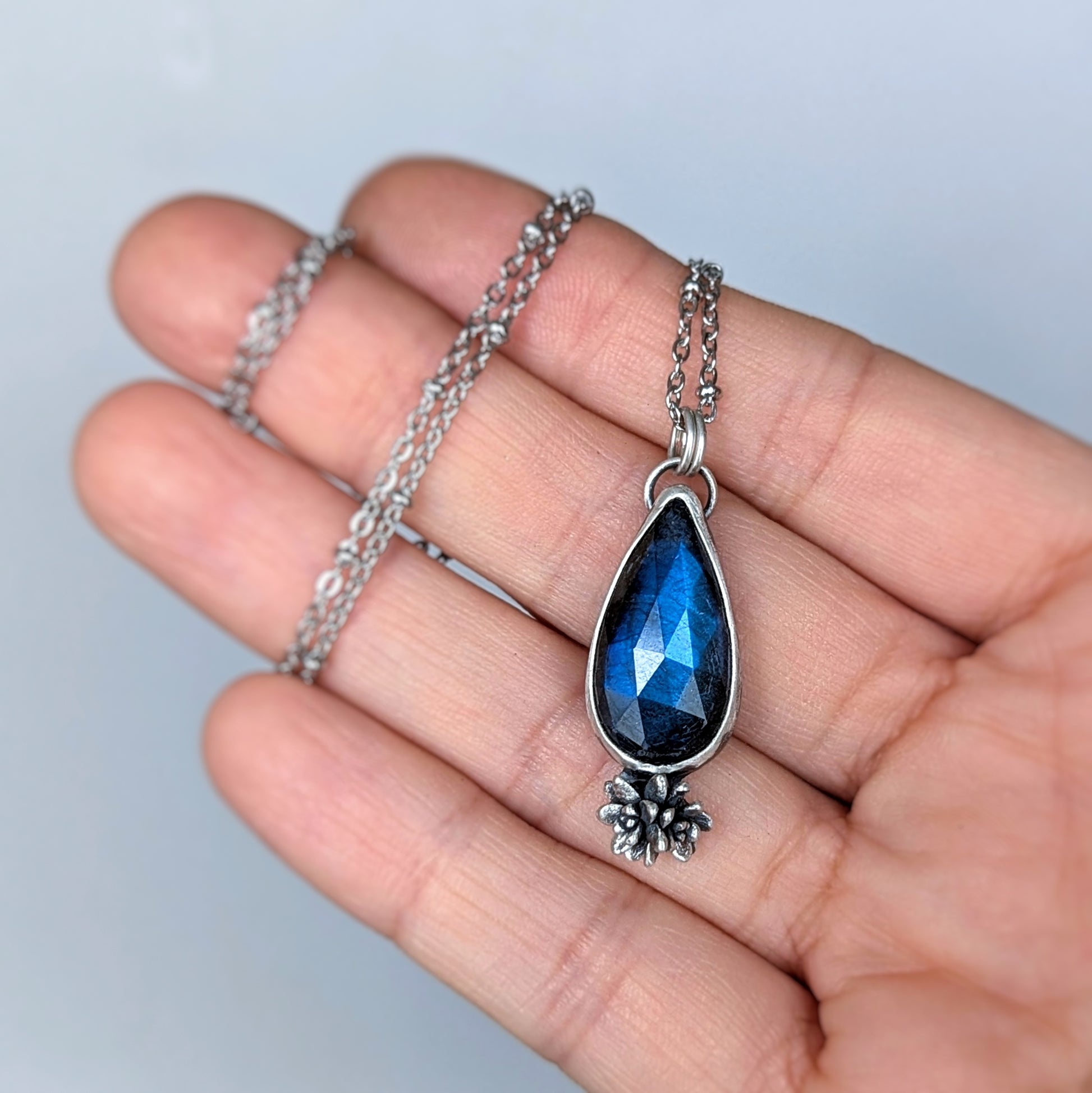 I've set a deep blue faceted labradorite gemstone in fine silver, and then added an intricate, genuine cast solid sterling silver succulent bouquet accent. It hangs from a stainless steel dotted satellite chain, adjustable at 18 and at 20 inches. If you need a different length, just leave me a note at checkout!