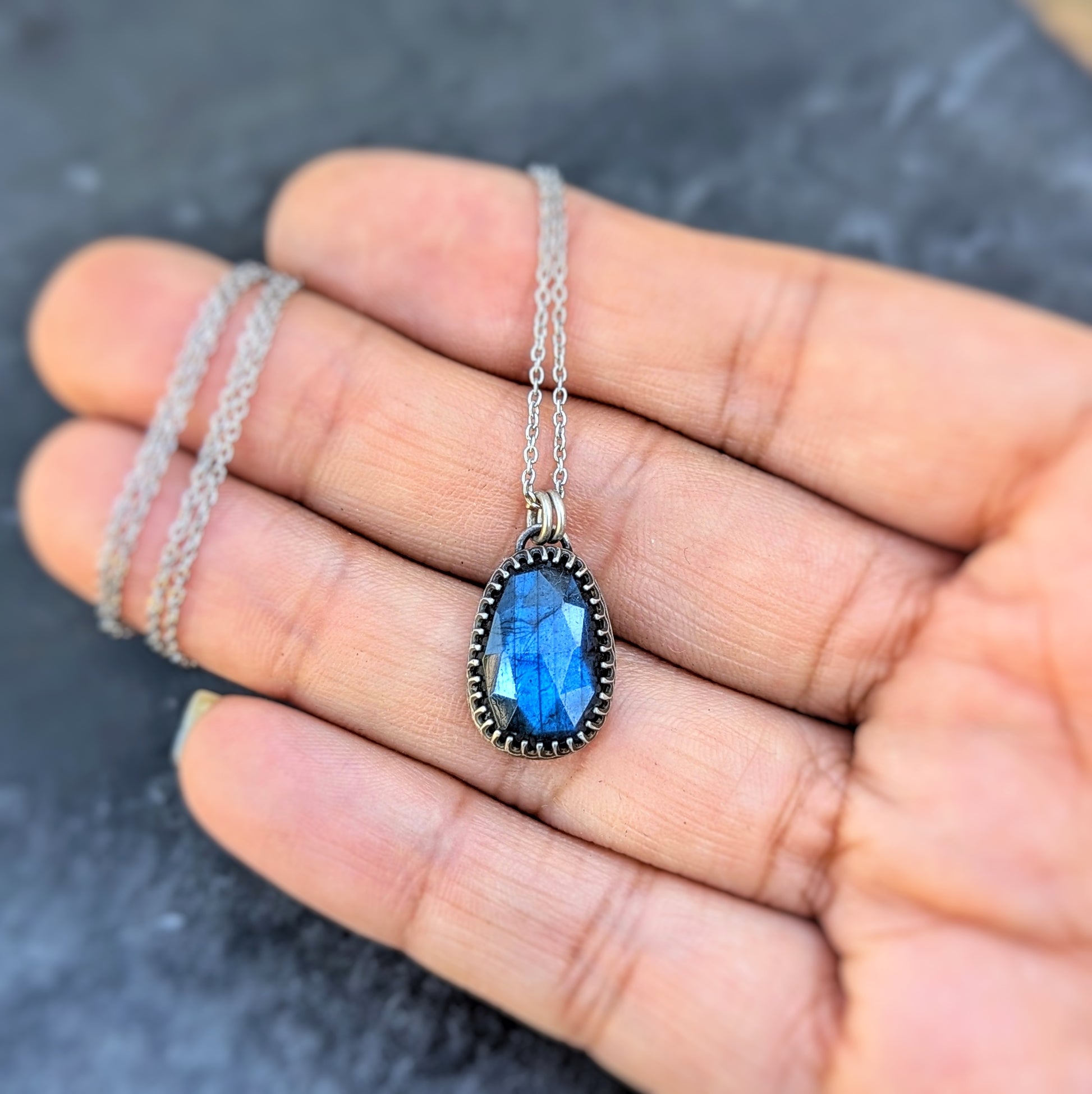 This pendant features a deep blue rose-cut labradorite, its faceted surface catching flashes of indigo and violet with every movement. Set simply in sterling silver, the stone’s natural glow is the star- luminous yet understated, mysterious yet timeless. Suspended from a delicate, hypoallergenic stainless steel18-20 inch adjustable chain, it’s an everyday talisman of intuition and inner light.