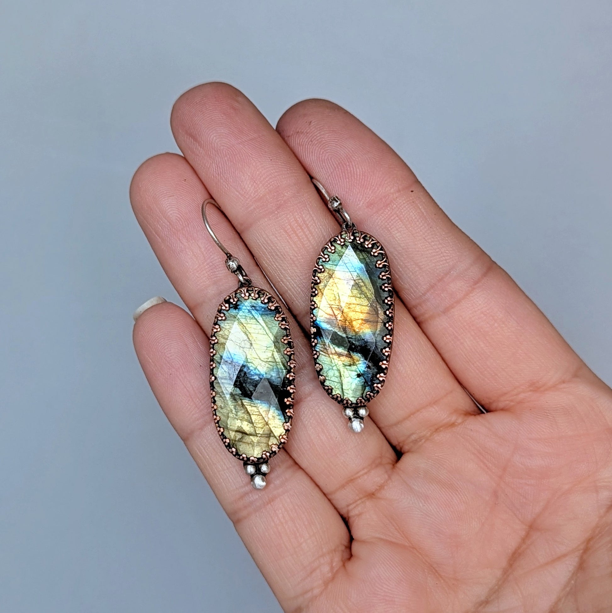 Born from the slow alchemy of the earth and shaped by hand at the bench, these earrings are a singular celebration of labradorite’s luminous spirit. These gems- carefully chosen for their deep, shifting flashes of blues, greens, and gold- are part of a rare, matched pair, brought together to create these one-of-a-kind earrings. They rest in sterling silver settings with richly embossed art nouveau pattern copper backs, and hang from graceful, hand-forged sterling silver ear wires: every detail crafted to honor the gem’s natural beauty. More than adornment, they are wearable art- bold, radiant, and entirely unique.