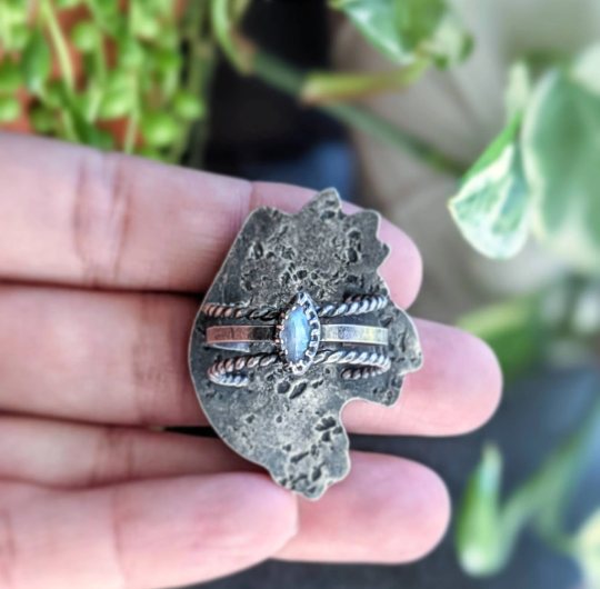This stunning one of a kind sterling silver statement ring features a rare rough-cut rainbow moonstone with tourmaline inclusions.