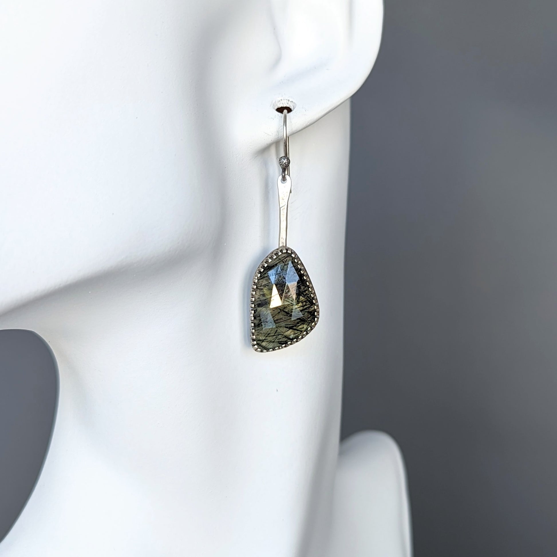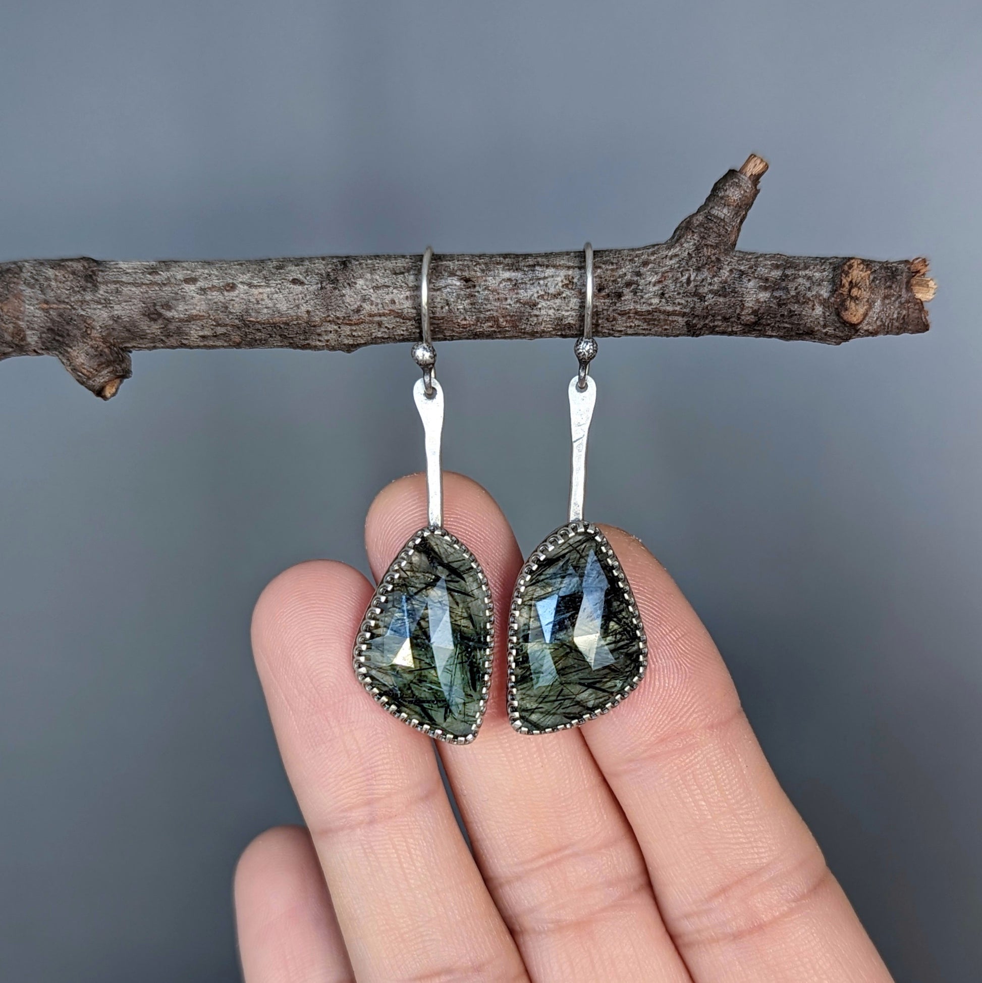 Two rare green rutilated quartz gemstones with a rare cut are set in sterling silver and embellished with hand forged sterling details.