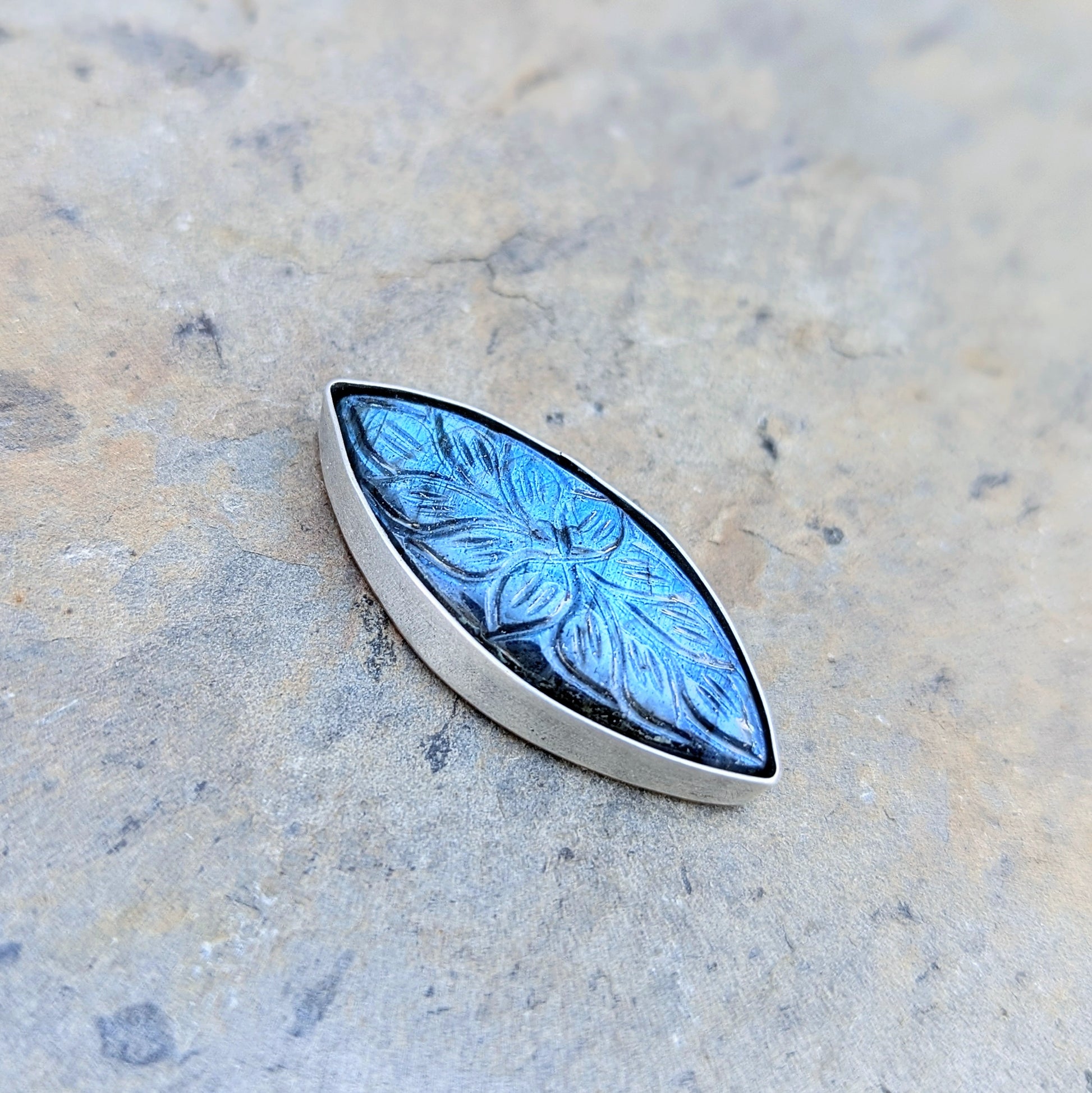From the Aurora Bloom Collection- a series of luminous, nature-inspired jewels- this ring centers around a rare, hand-carved labradorite gemstone alive with shifting flashes of blue and green. Each gem is individually carved with botanical motifs, making every piece truly one-of-a-kind.
