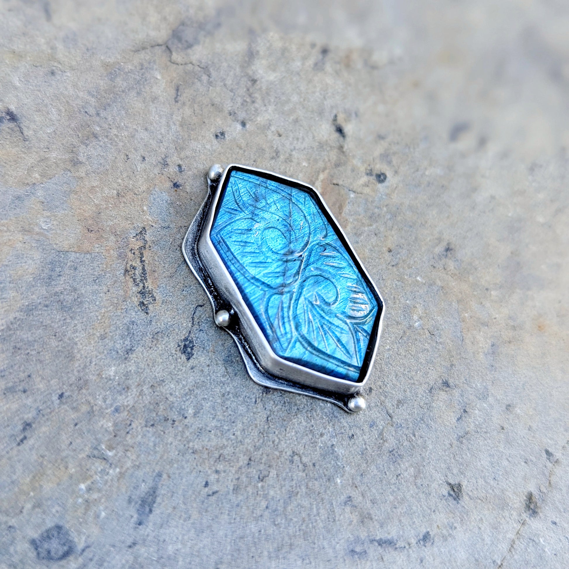 From the Aurora Bloom Collection- a series of luminous, nature-inspired jewels- this ring centers around a rare, hand-carved labradorite gemstone alive with shifting flashes of blue and green. Each gem is individually carved with botanical motifs, making every piece truly one-of-a-kind.