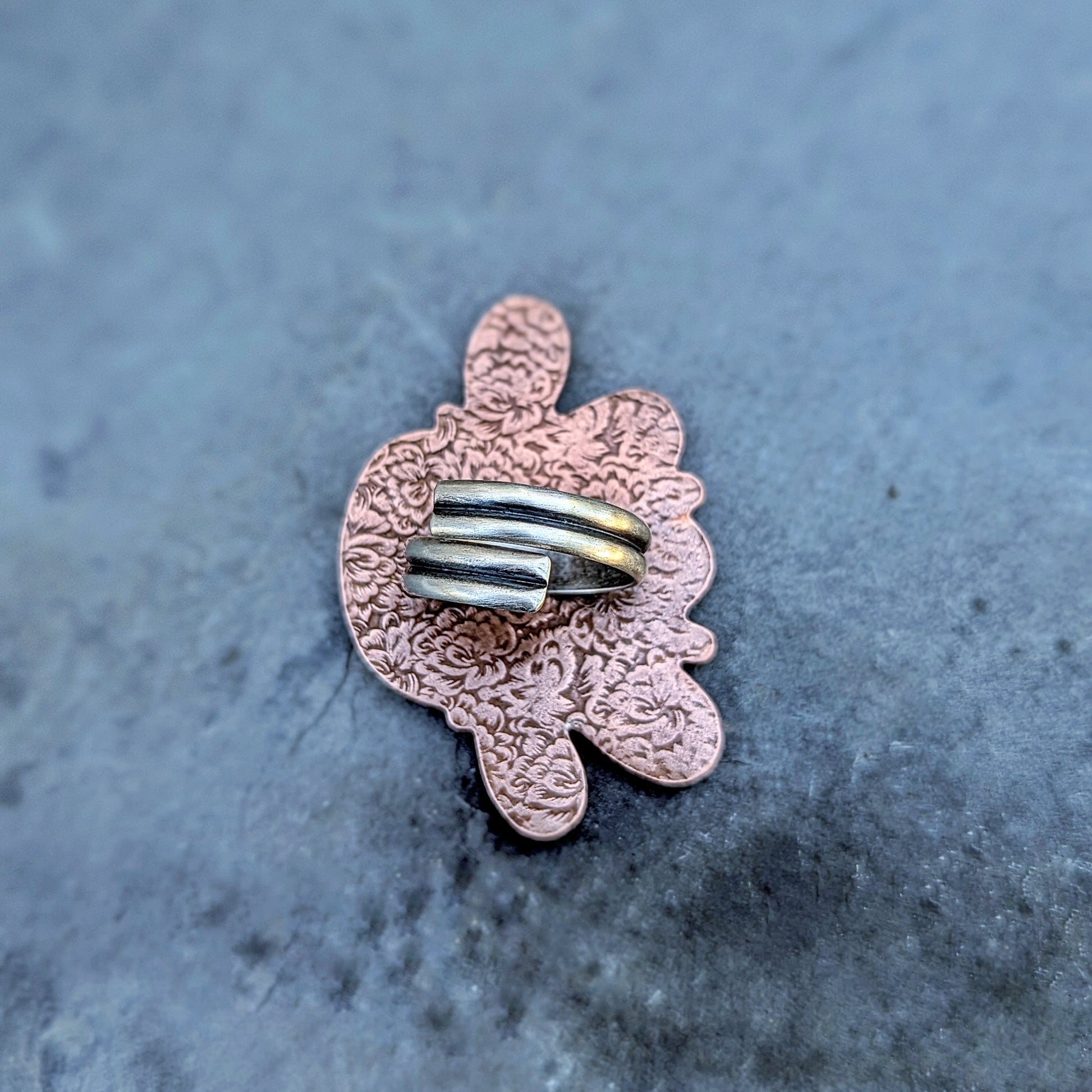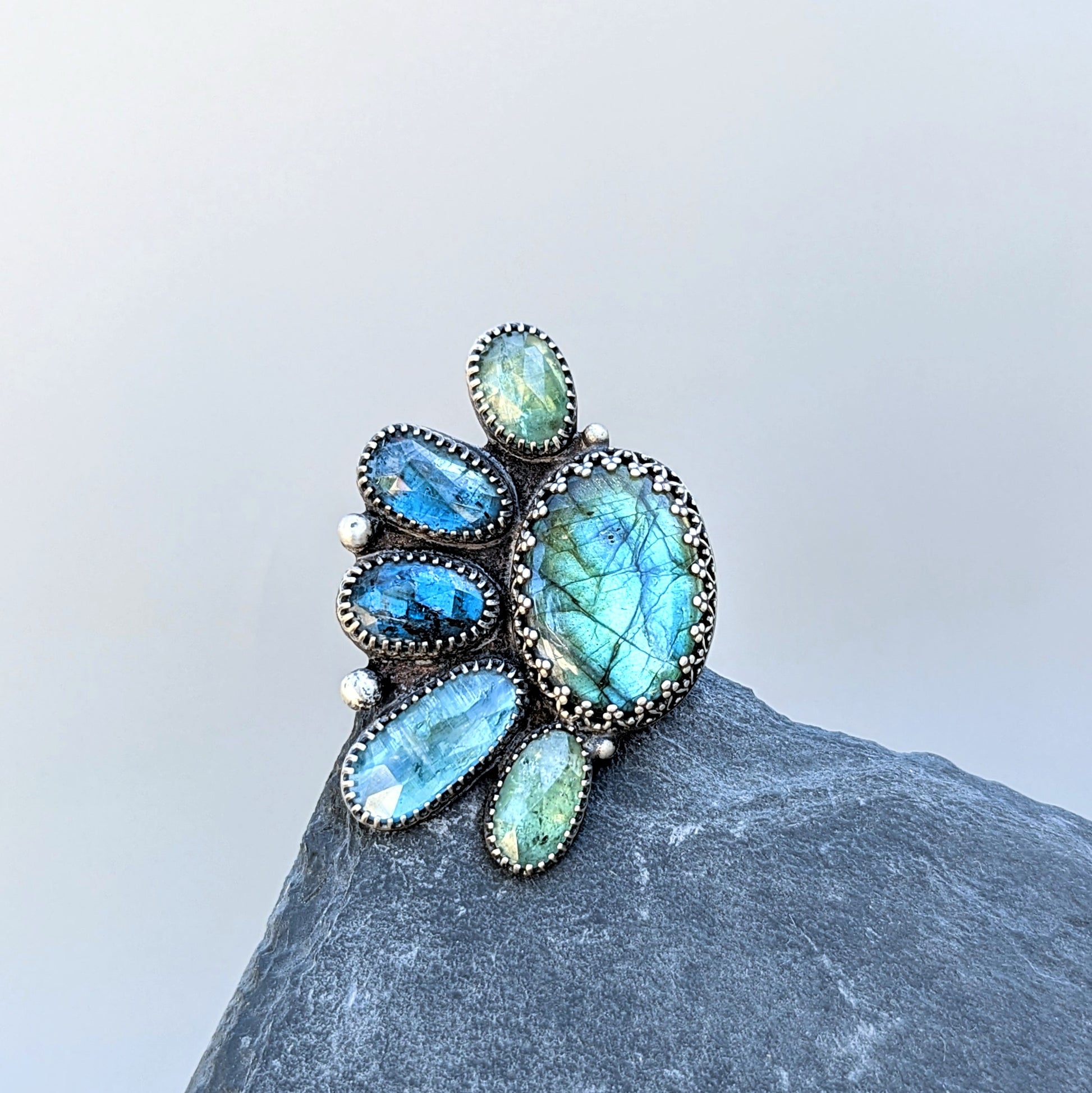 A statement ring that feels like a fragment of the natural world captured in metal and light, this one-of-a-kind piece weaves together the luminous depths of labradorite with the vivid, silken sheen of green and blue kyanite. Each gemstone is hand-set in sterling silver, their organic forms framed by sculptural silver accents that echo the artistry of fine bespoke jewelry. A warm copper backplate glows subtly beneath the stones, adding richness and contrast, while the adjustable sterling silver band ensures a comfortable, tailored fit. Bold yet refined, this ring is a celebration of elemental beauty- a piece meant to be noticed, a modern heirloom.