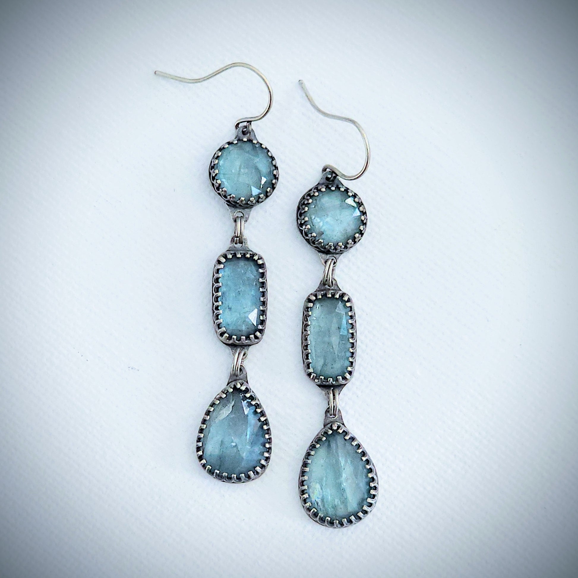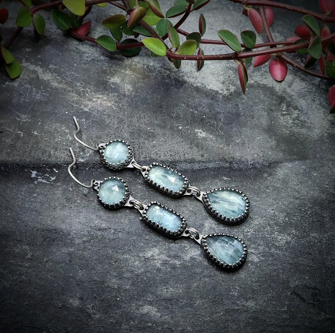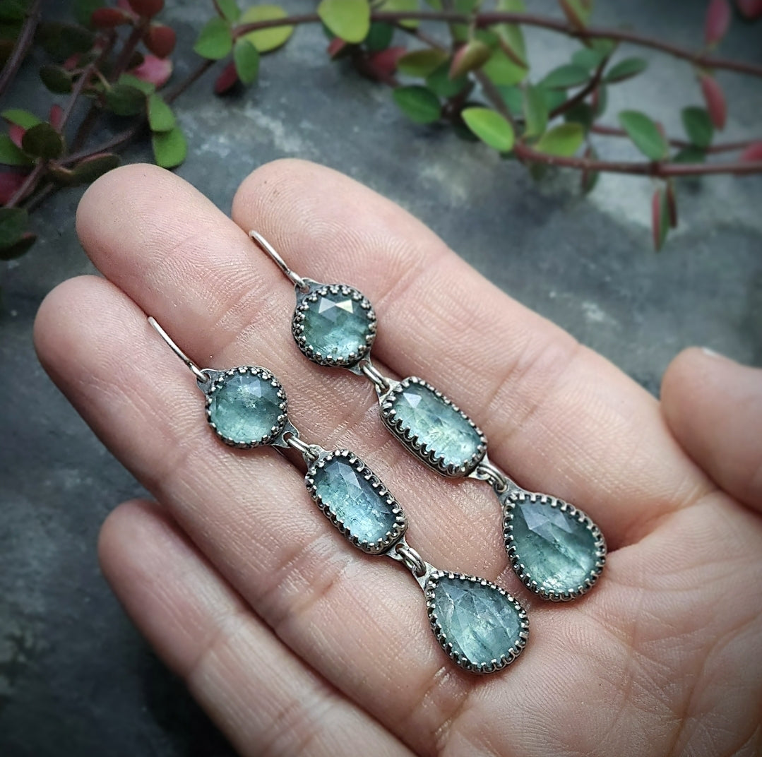 Six gemmy, sparkling, faceted aqua kyanite gemstones are set in sterling silver to create these delicate one of a kind earrings.