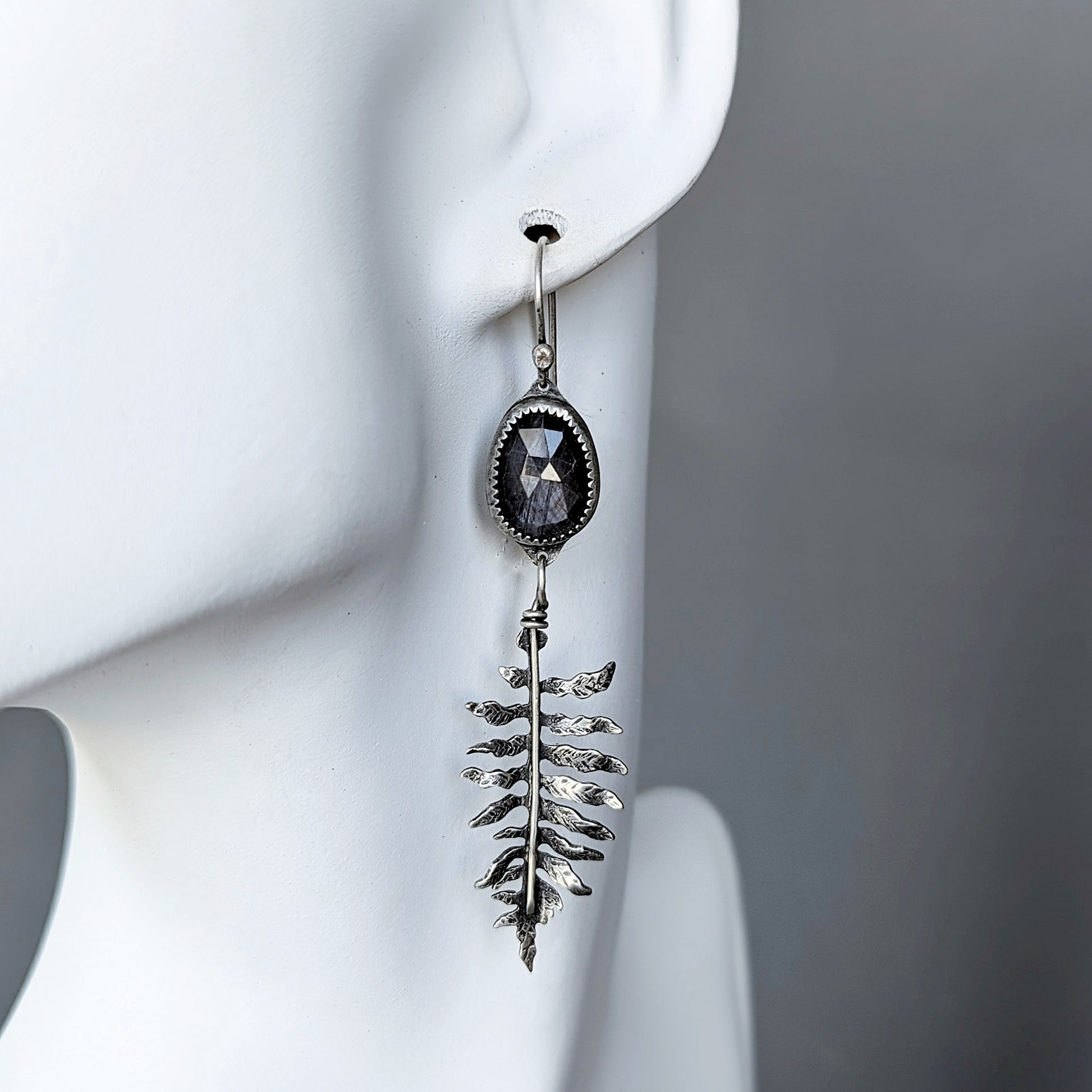Two shimmering, faceted, genuine gray sapphire gemstones adorn a pair of handcrafted sterling fern leaves. I fabricated the ferns from sheet metal and wire- sawing, engraving, soldering, polishing, and texturing each delicate leaf.